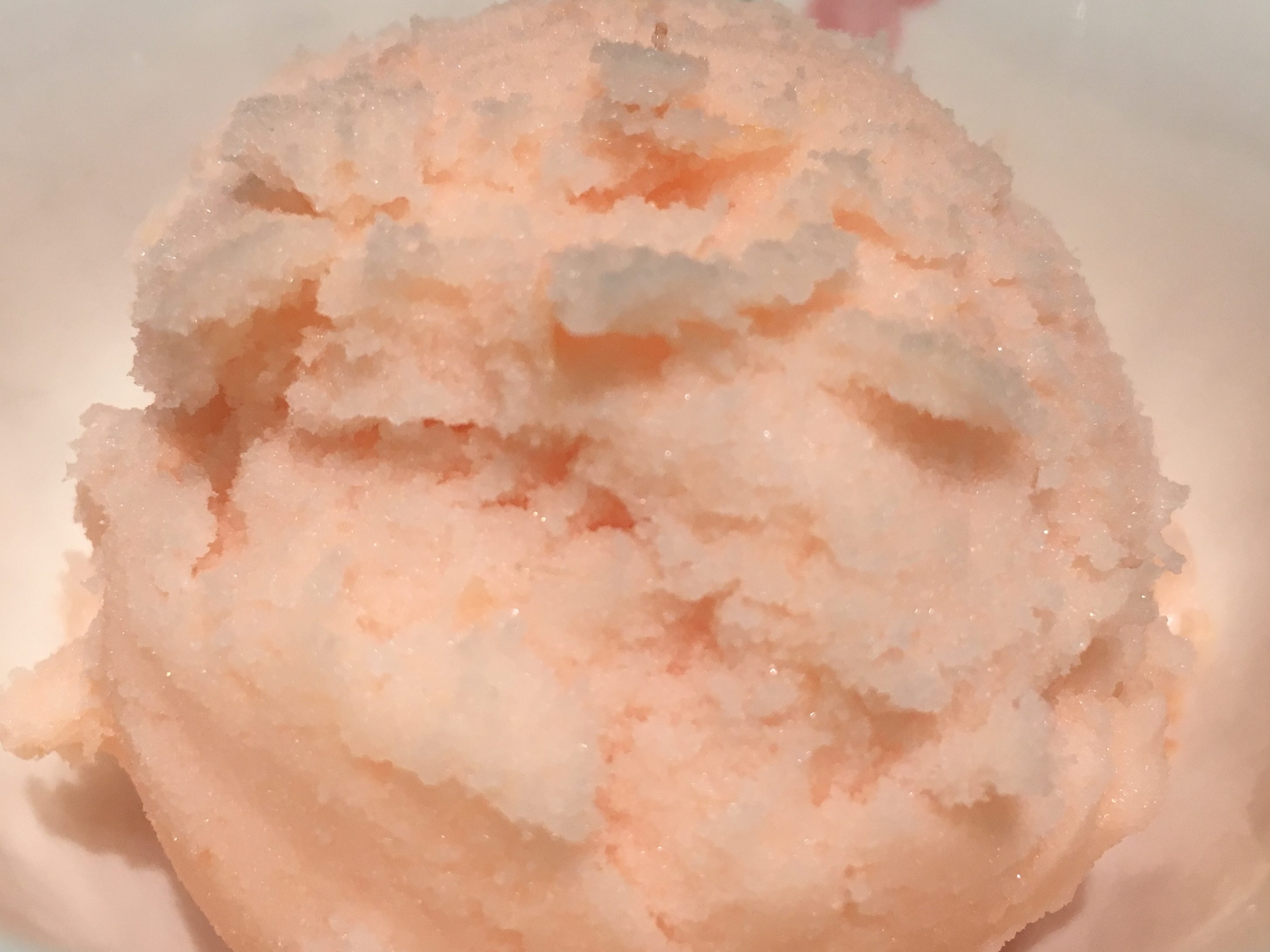Zutaten: 350 ml Grapefruit-Saft (frisch aus dem Entsafter), 100 g Zucker, 2 Eiweiß (Eischnee), 50 ml Aperol, 50 ml Wasser; die Eismaschine arbeitet 45 Minuten