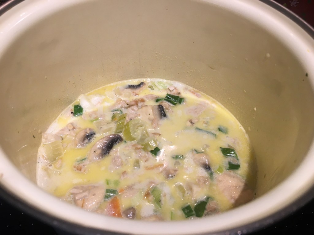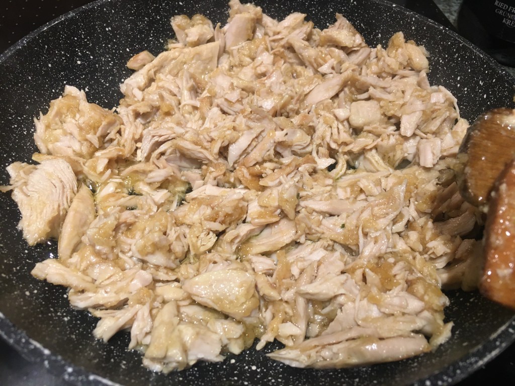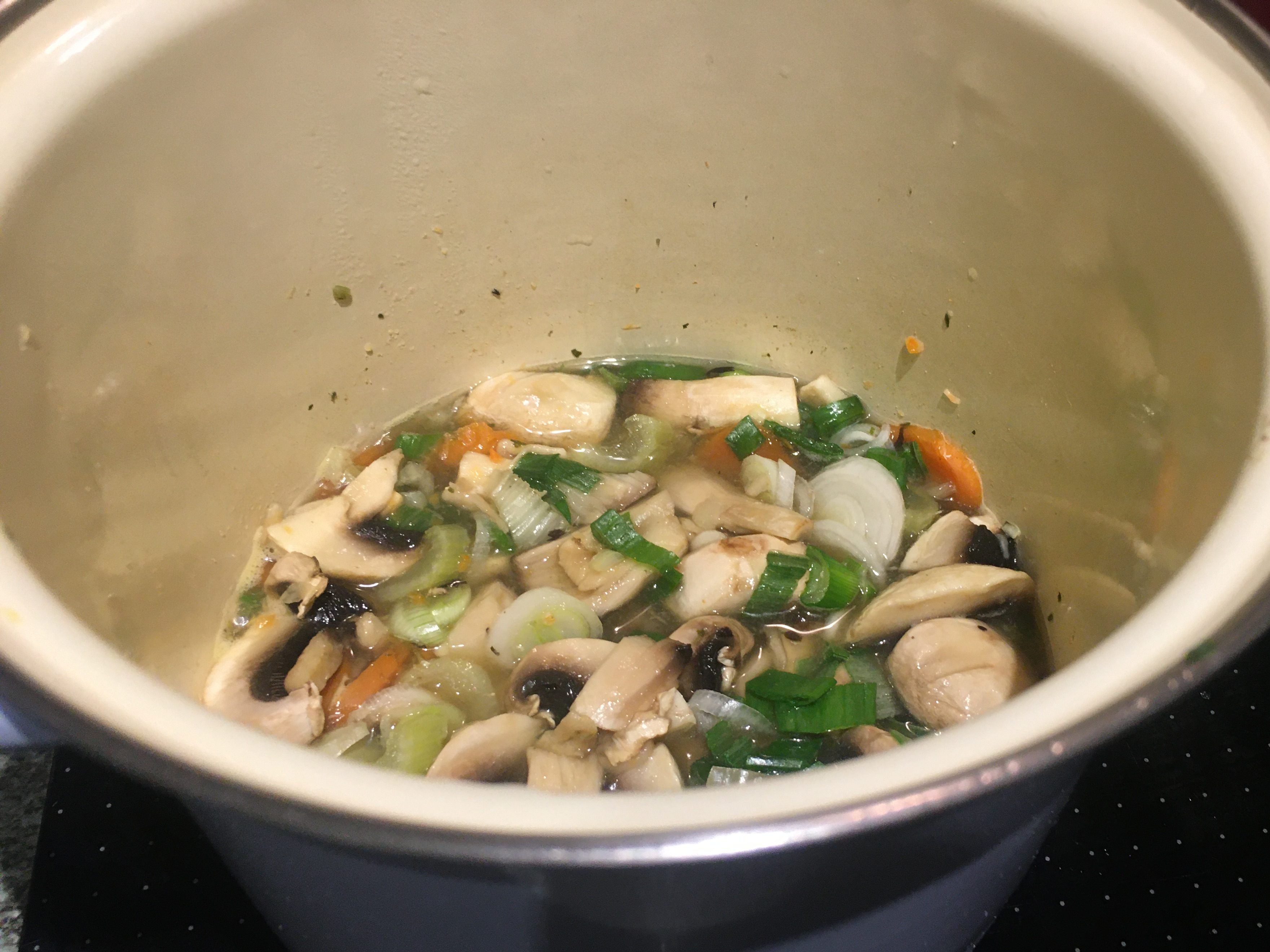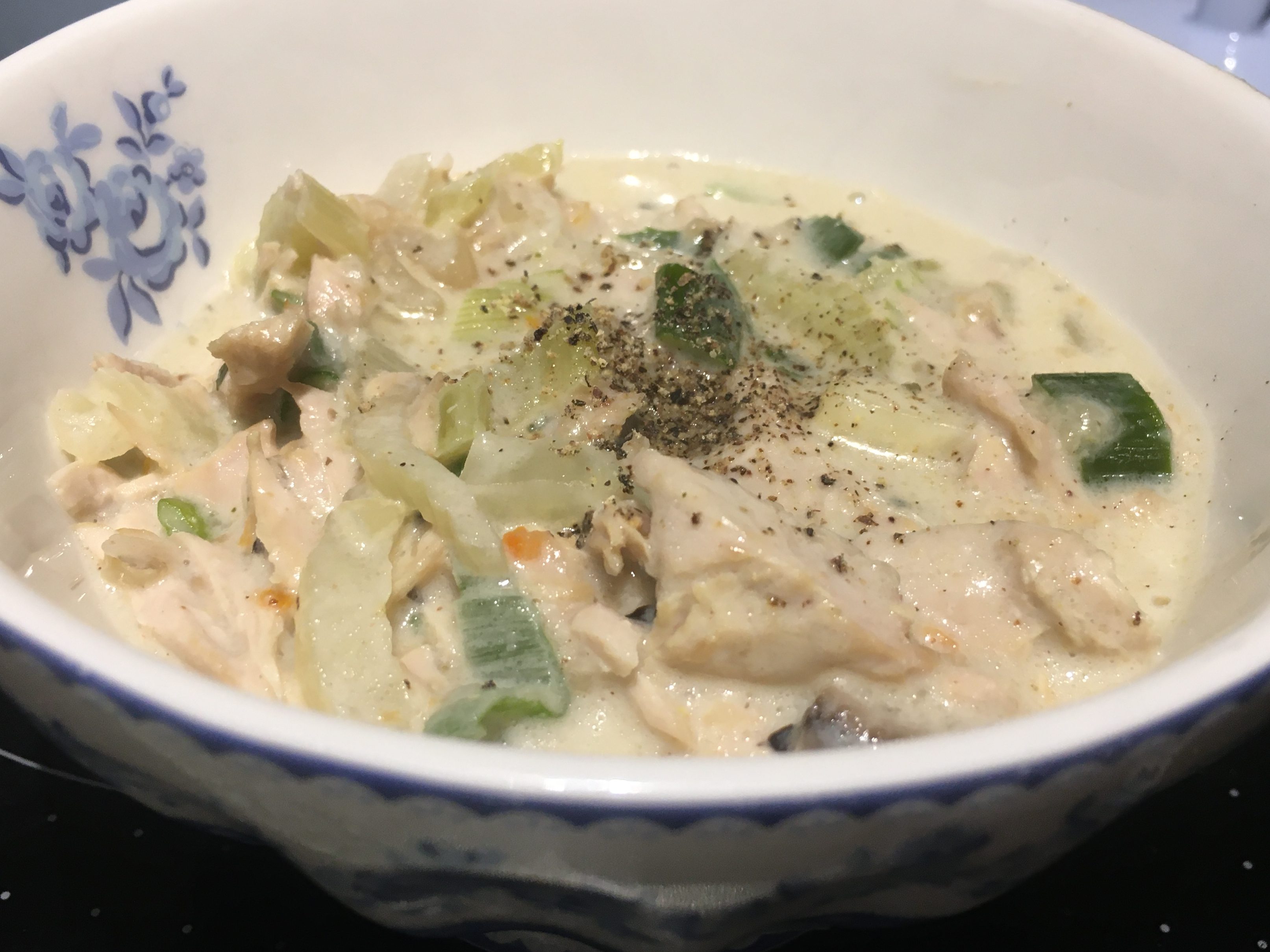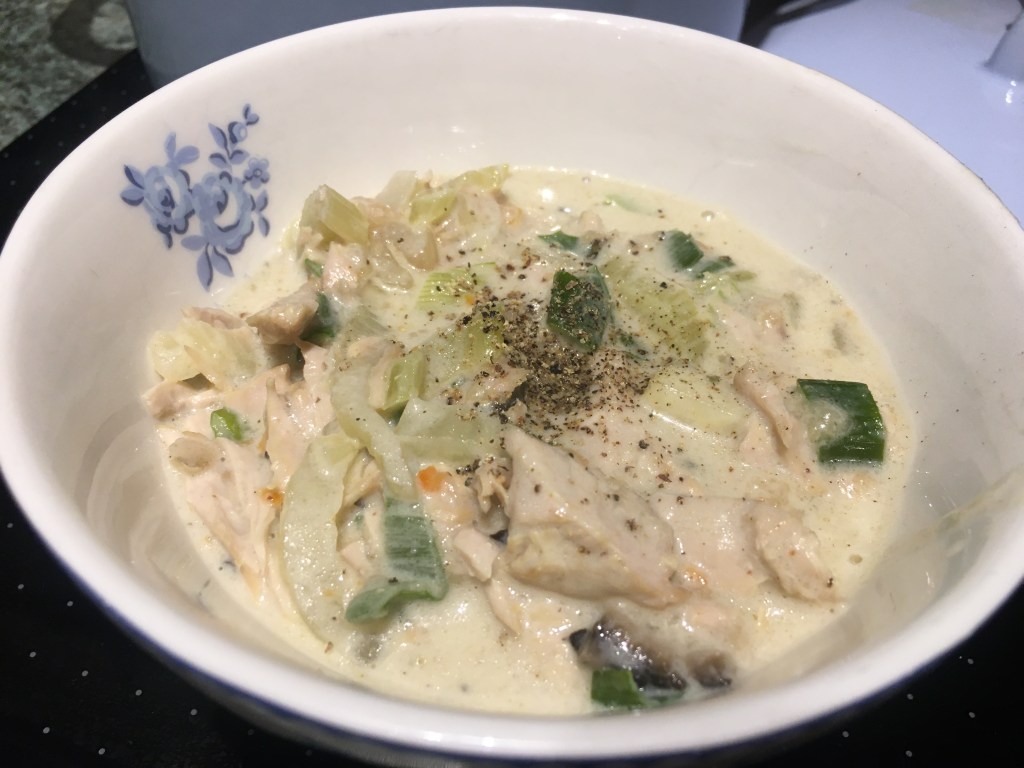 Zutaten: 1 Huhn, ca. 1,5 kg (ich hatte 500 g Brustfilet), 750 ml Geflügelbrühe (ich habe 250 ml genommen), 2 Zweigen Thymian, 2 Lorbeerblättern, 2-3 Gewürznelken, Pfeffer in einen großen Topf geben, 45 Minuten köcheln lassen (ich habe es 30 min gemacht). 3 Möhren, 2 Stangen Staudensellerie, 1/2 Fenchel schneiden, am Ende der Kochzeit des Huhns zufügen, 15 Minuten mitgaren. 200 g Zuckerschoten (ich hatte Lauch genommen), 7 weiße Champignons schneiden, 5 Minuten am Ende mitgaren. 75 g Butter zerlassen, 3 EL Mehl einrühren mit 100 ml Weißwein ablöschen. Fleisch in Stücke zupfen, in die Butter-Mehl-Wein-Sauce geben, anbraten. 200 ml Sahne zu Brühe geben, einkochen lassen, das gebratene Fleisch dazu geben. Mit 1 Spritzer Zitronensaft (frisch), Salz, Pfeffer, Muskatnuss abschmecken.