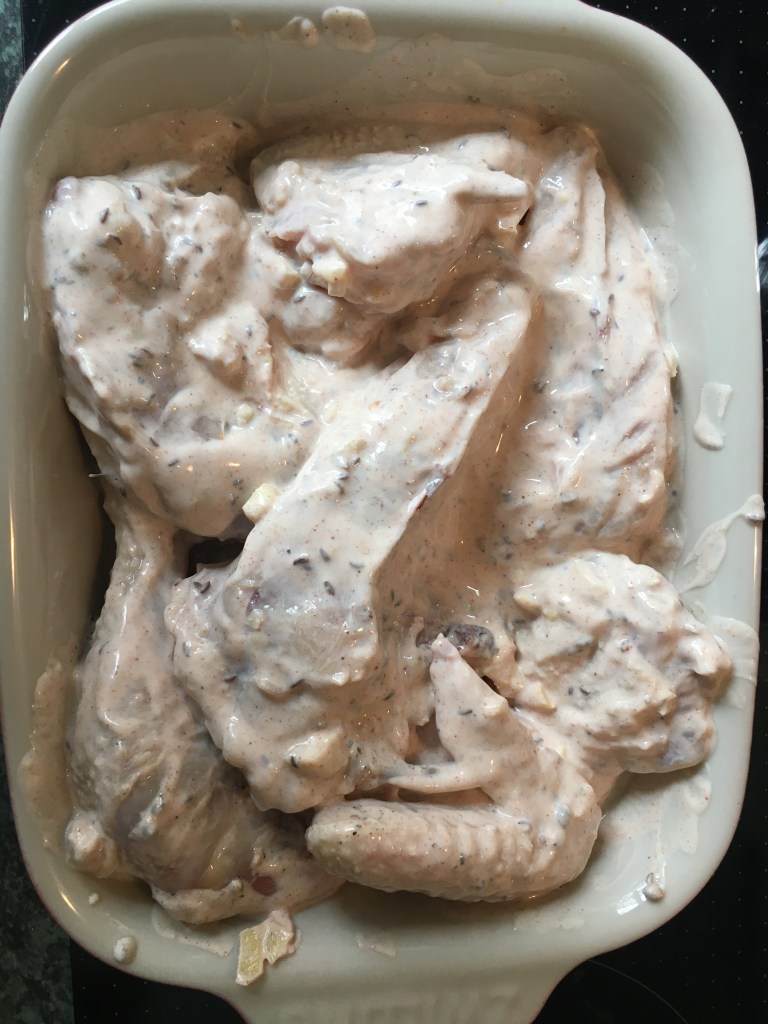 Zutaten: 600 g Hähnchenbrustfilet (ich hatte ein Hähnchen ca. 1 kg), 1 großes Stück Ingwer, 2 Knoblauchzehen, Saft 1 Zitrone (frisch), 500 g Joghurt, 1 EL Tandoori, 1 TL Paprikapulver, 1 TL Kreuzkümmelpulver, 1/2 TL Zimt, 1/2 TL Chiliflocken, 2 TL Kurkumapulver, 1 TL Koriandersamen, 2 Lorbeerblätter. Ingwer und Knoblauch schneiden mit den anderen Zutaten mischen, das Fleisch im Joghurt-Gewürze-Mix über Nacht ziehen lassen. Ofen bei 180 Grad vorheizen. Das Fleisch aus der Sauce rausnehmen, 30 Minuten im Ofen backen. Lorbeer aus der Marinade entfernen. Marinade mit Tomaten (400 g passierte Tomaten) und 150 ml Geflügelfond mischen, das Fleisch dazu geben und noch 30 Minuten zusammen köcheln lassen.