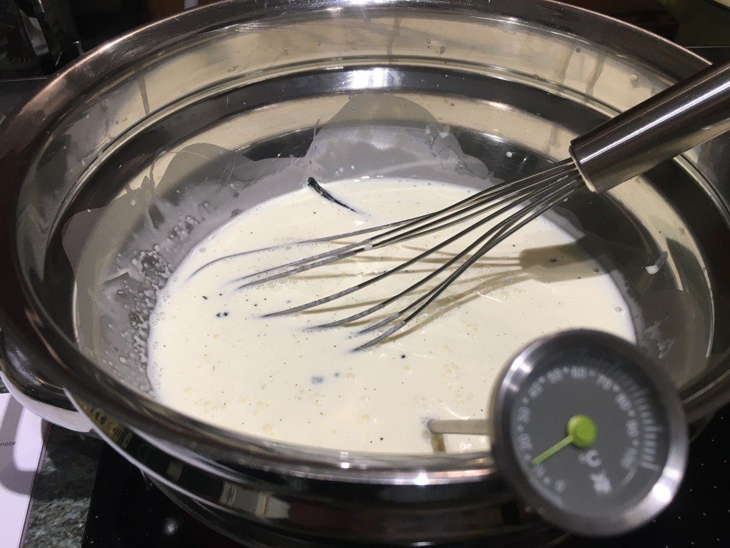 Zutaten: Eis: 1 Vanilleschote, 3 Eigelb, 90 g Zucker (ich nehme 50 g), etwas Salz, 300 ml (Milch und Sahne); 100 g gesalzene Pistazienkerne, zerkleinern