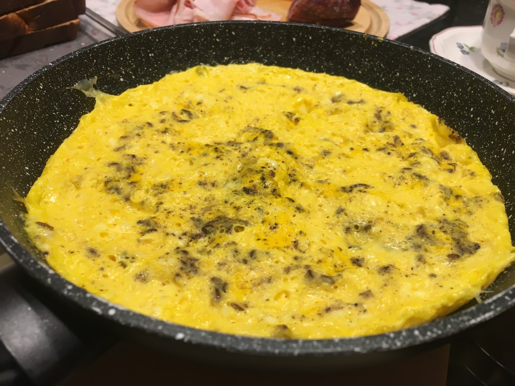 Alle Zutaten verquirlen. Die Pfanne erhitzen, die Masse zuerst bei maximaler Hitze ohne Deckel braten (2 Minuten), danach langsam alle 2 Minuten die Hitze reduzieren (zugedeckt) – insgesamt ca. 6-8 Minuten braten. Das Omelett wird dadurch luftig, saftig, brennt nicht an.