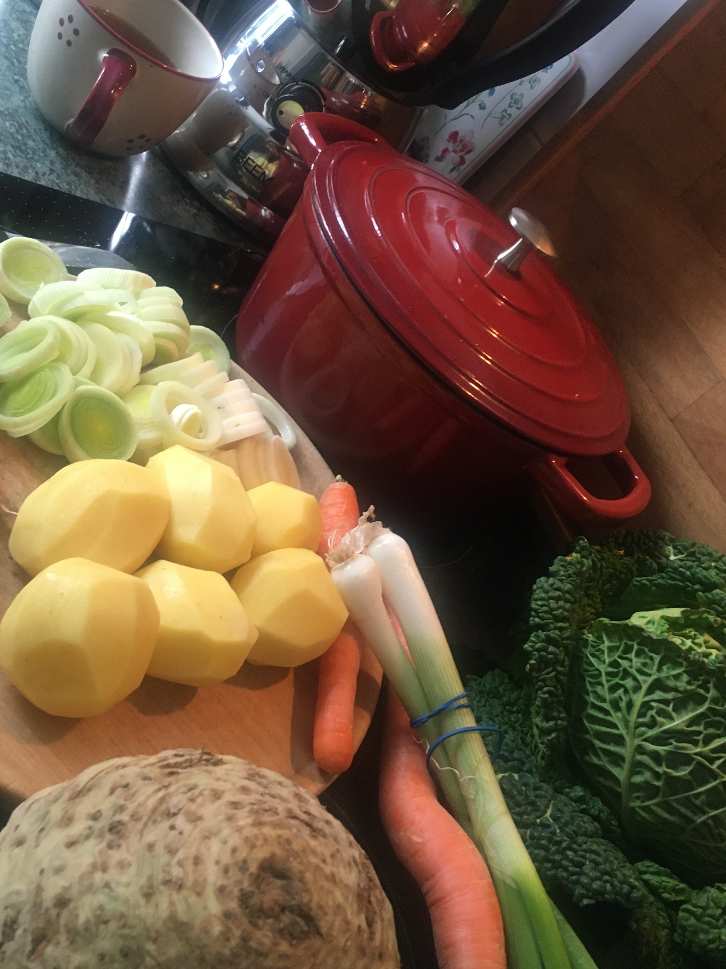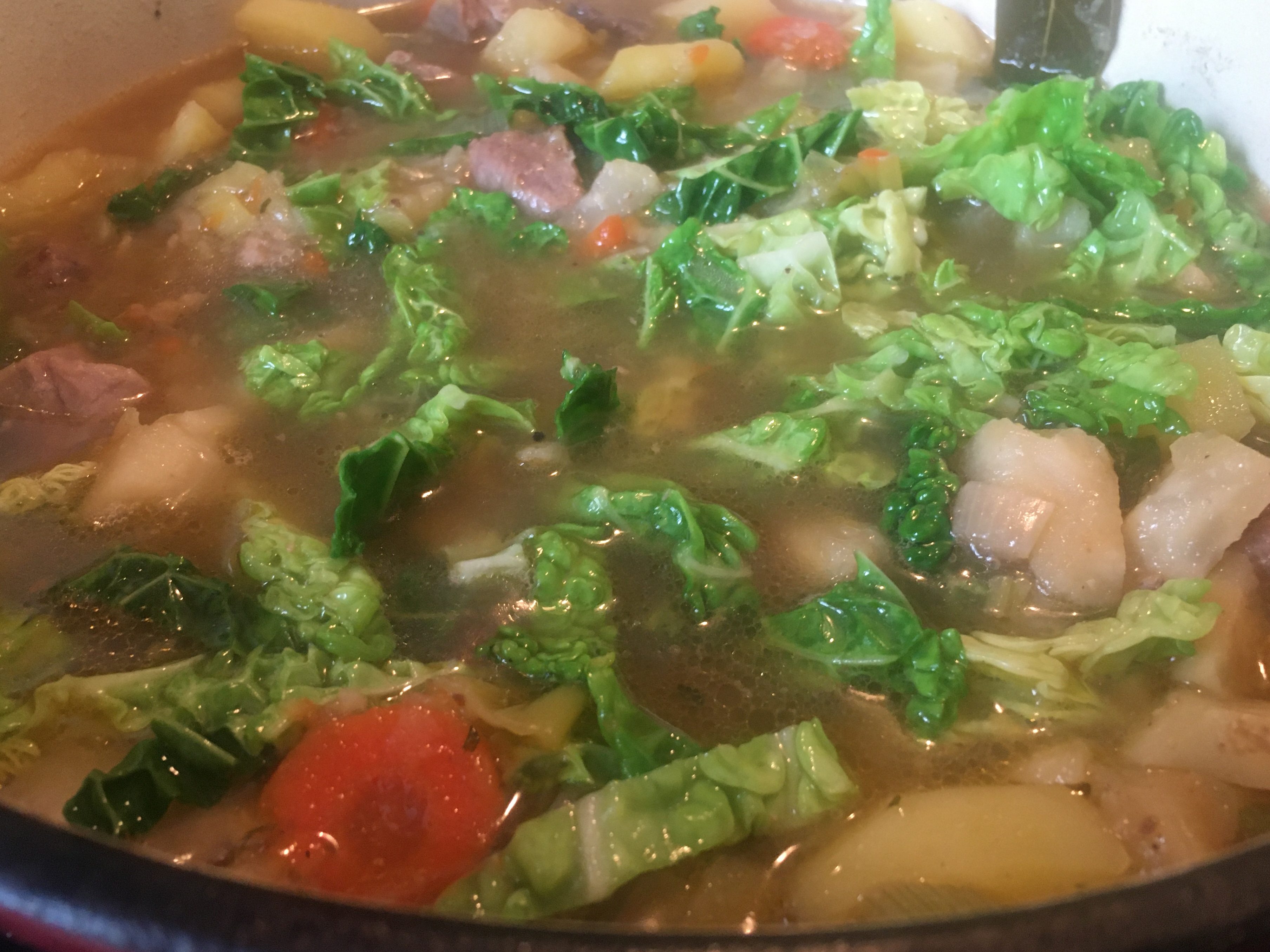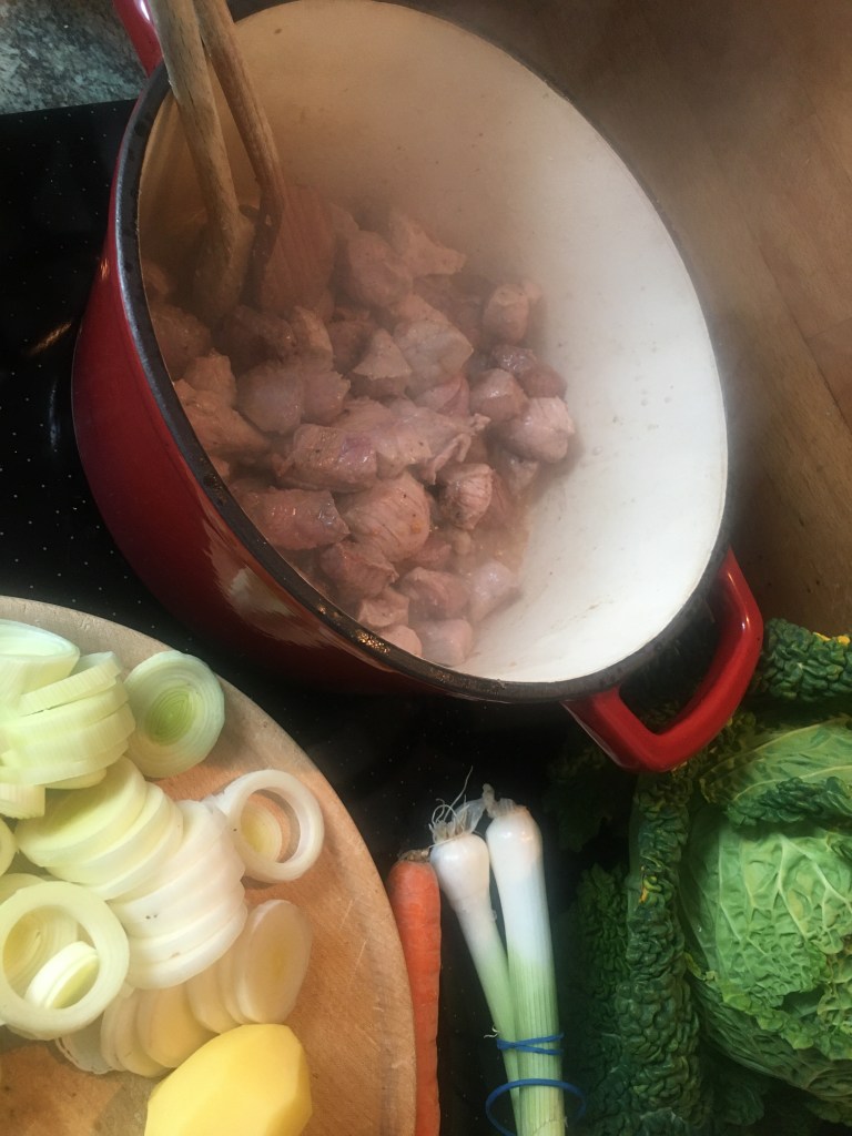 Zutaten: 1 Zwiebel (ich nehme Porree), 1 Knoblauchzehe, 1 Möhre, 100 g Knollensellerie, 1 Petersilienwurzel, 200 g Kartoffeln, 1 Stange Lauch, 8 Wirsingblätter, Fleisch (gemischt) Rinderschulter, Schweineschulter, Lamm (ich hatte Rind und Schwein) 500 g, Rapsöl und/oder Schweineschmalz, 1 L Kalbsfond, Salz, Pfeffer