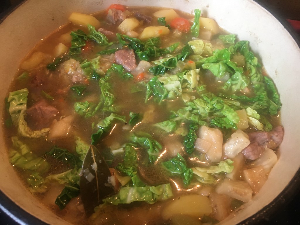 Das Fleisch in 3 -4 cm lange Streifen schneiden, kräftig anbraten. Zwiebel (Porree), Knoblauch, Karotte, Sellerie, Petersilienwurzel kurz mit andünsten. Lauch, Kartoffeln dazugeben, mit Fond ablöschen und zugedeckt 40 Minuten weich dünsten. In den letzen 10 Minuten Wirsing (in Streifen geschnitten) untermischen und mit köcheln.