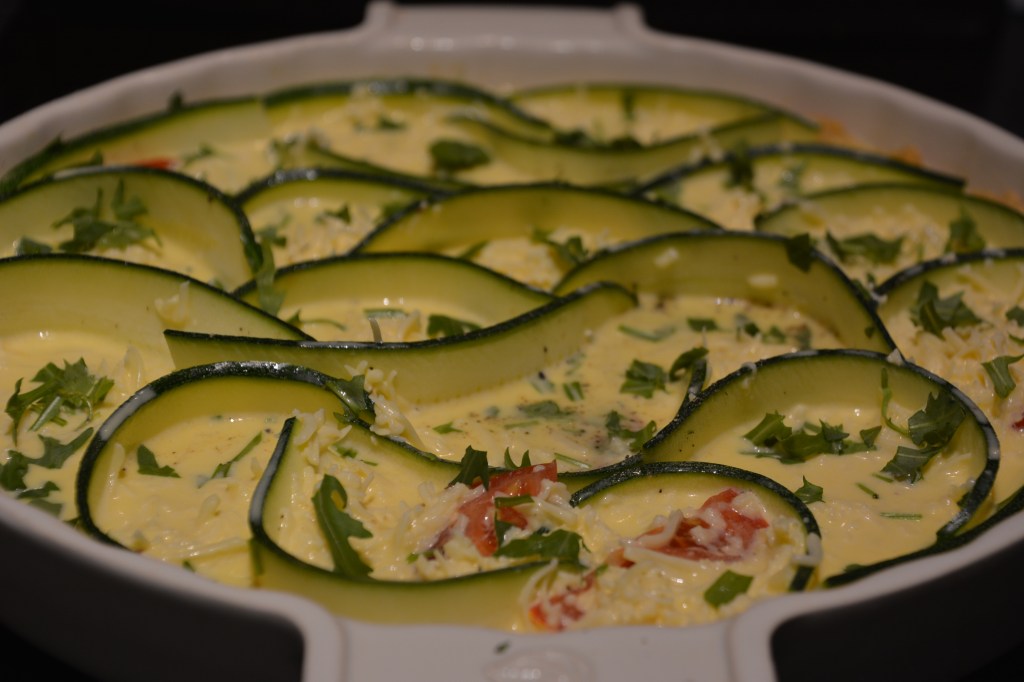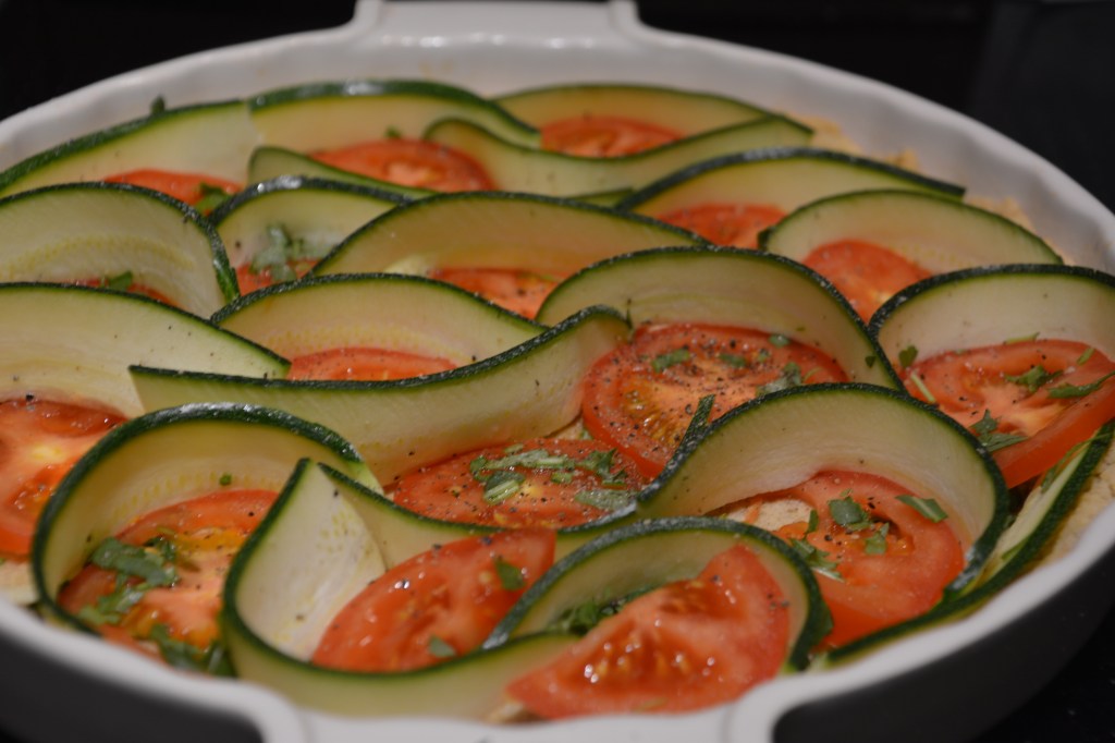 Teig-Zutaten kneten, Mürbeteig erstellen, 30 Minuten kühl stellen. Backofen auf 160 Grad (Umluft) vorheizen. Quicheform fetten, mit dem Teig dünn auskleiden, 10 Minuten blindbacken. Tomaten in Scheiben schneiden, Zucchini längs dünn hobeln (ich habe es mit Hilfe meiner Brotschneidemaschine gemacht), auf dem Teig verteilen, den Eierguss (Sahne, Käse, Eier, Öl, Rucola, Salz, Pfeffer) drübergießen. 30 Minuten backen.