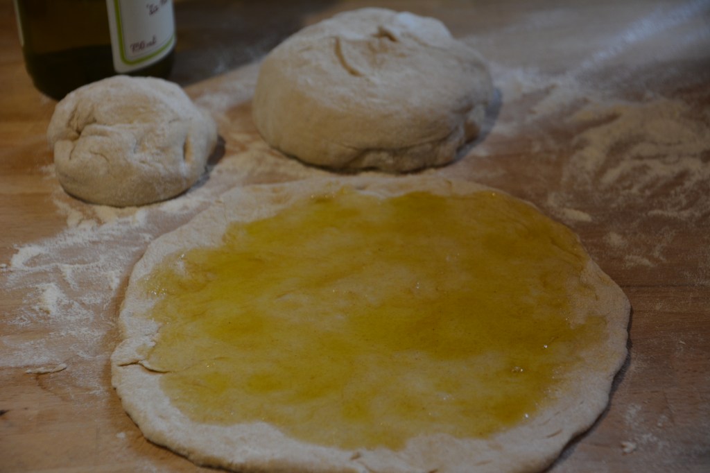 Kleine Pizza formen, Olivenöl und Knoblauchsalz verteilen