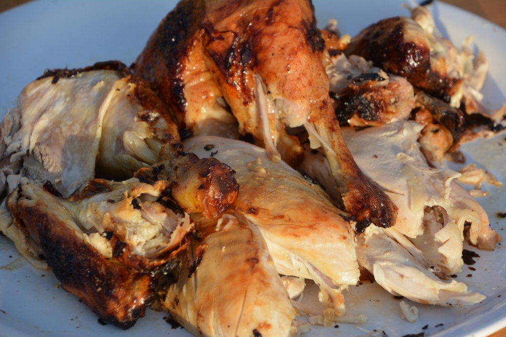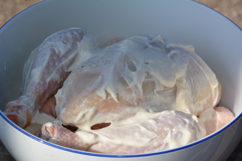 Zutaten: 1 Hähnchen ca. 1,5 kg, Marinade: Salz, Pfeffer, Knoblauchsalz, Miracle Whip oder andere Mayonnaise, Olivenöl (über Nacht im Kühlschrank marinieren lassen); Hähnchenhalter; Grollen im Holzofen (vorgeheizt auf 230 Grad) 50 Minuten
