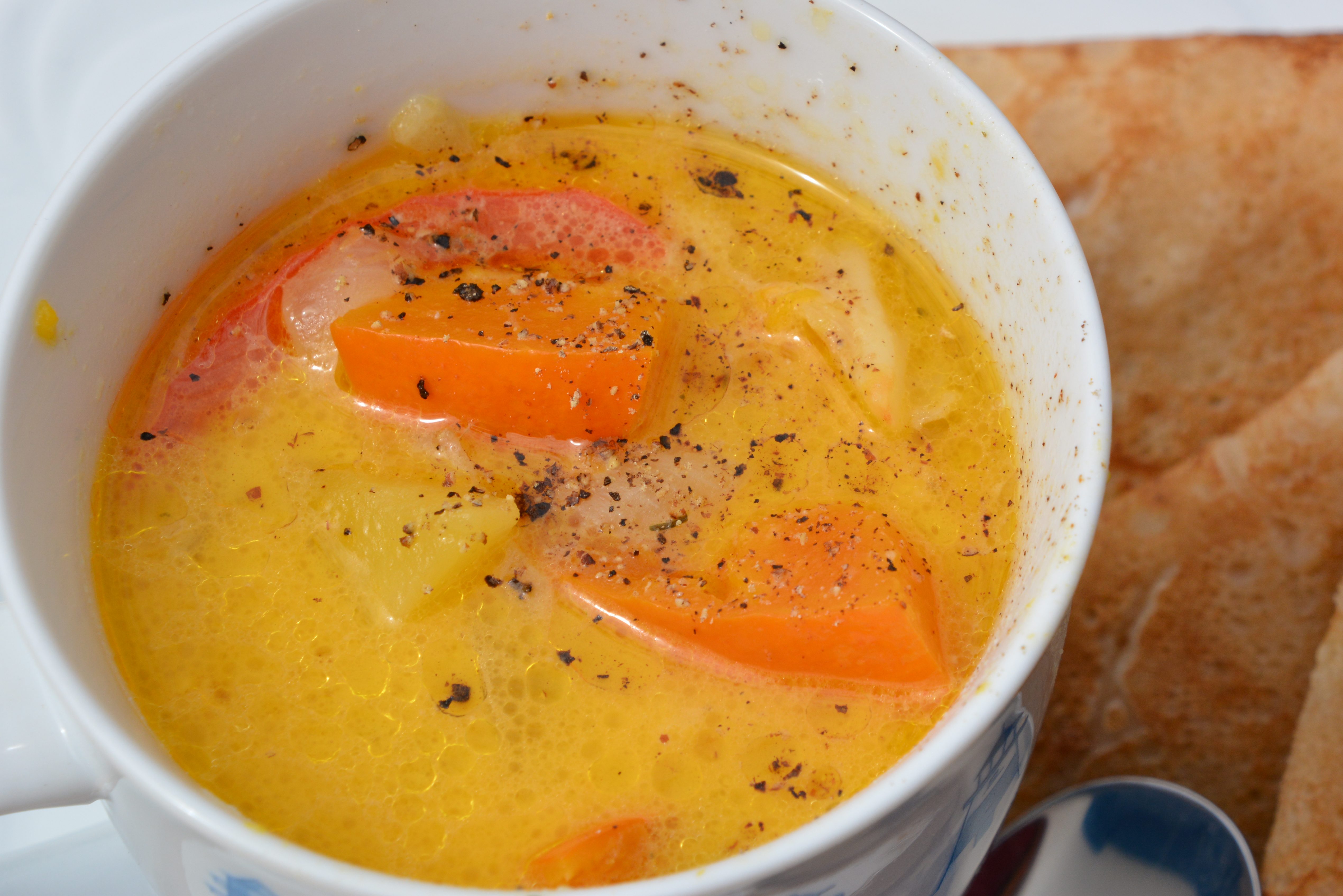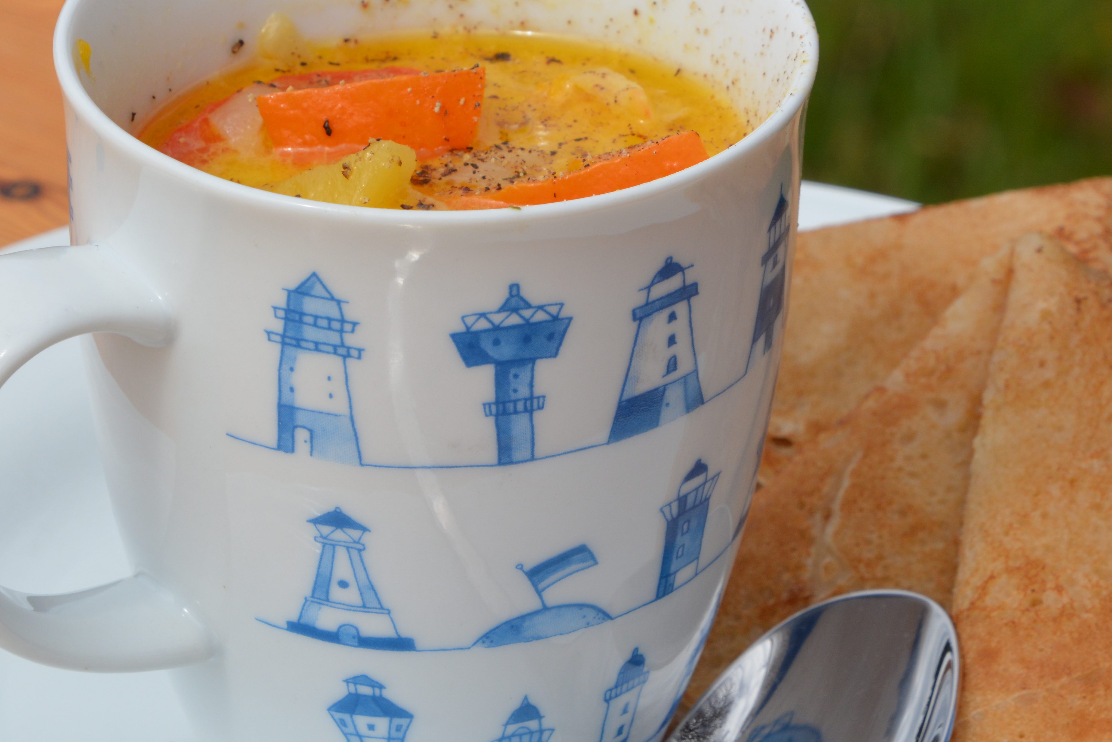 Zutaten: 1 Kürbis, 10 Blätter-Wirsing, 2 Zwiebeln, 1 Fenchel, 10 Bohnen, 3 Möhren, 2 Tomaten, 1 Paprika, 4 Kartoffeln, 300 ml Gemüse-Brühe; das Gemüse (Kürbis, Zwiebeln, Fenchel, Möhren, Kartoffeln) schneiden, im Öl kurz anbraten, 20 Minuten köcheln; 100 ml Sahne, Tomaten, Paprika, Bohnen dazu geben, noch 10 Minuten köcheln