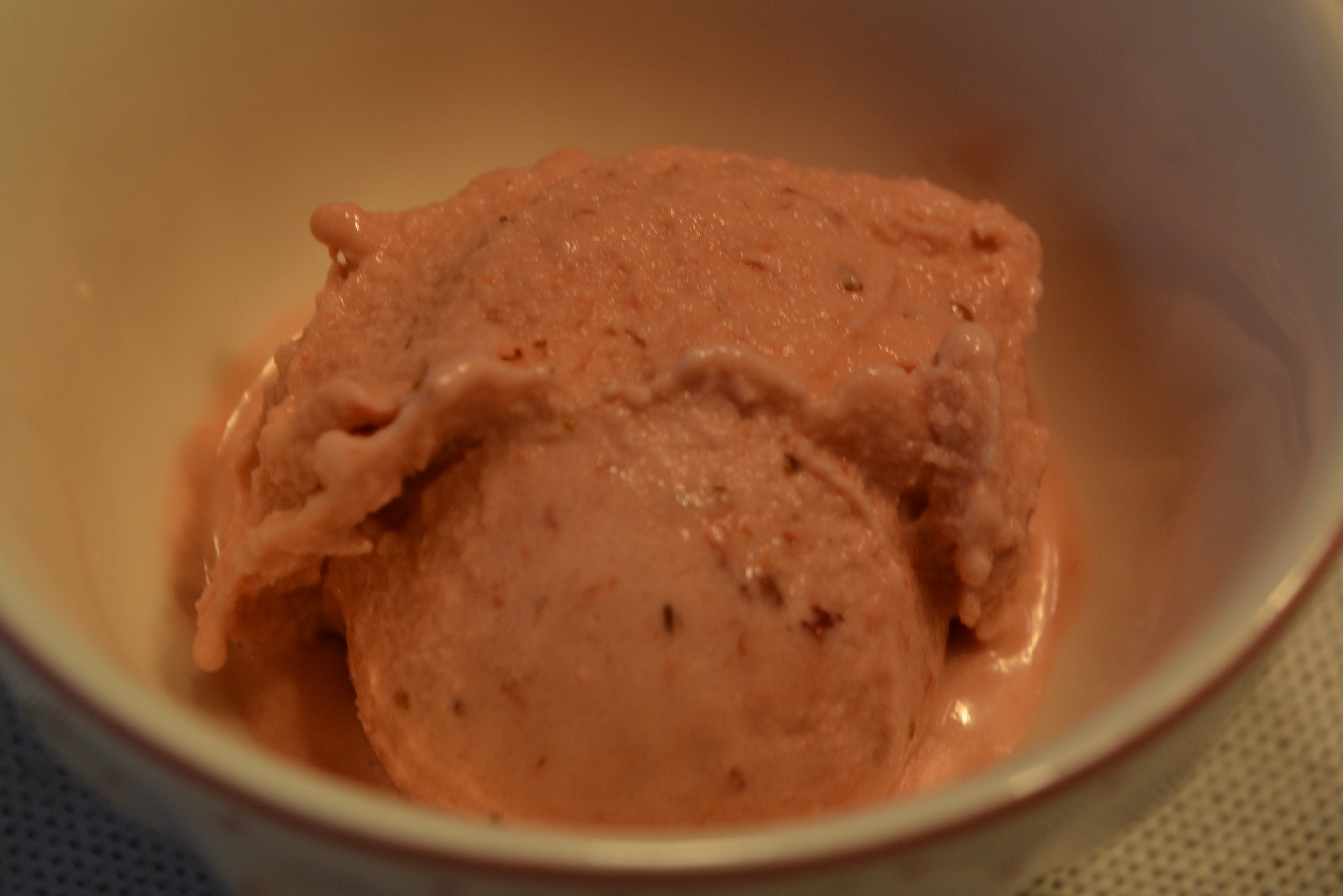 Zutaten: 300 g Erdbeeren (frisch), 100 ml Sahne, 100 ml Milch, 100 g Zucker, 2 Eigelb; die Beeren pürieren, Eigelbe mit Zucker aufschlagen, alle Zutaten vermischen; mit Hilfe einer Eismaschine frieren lassen (60 Minuten)