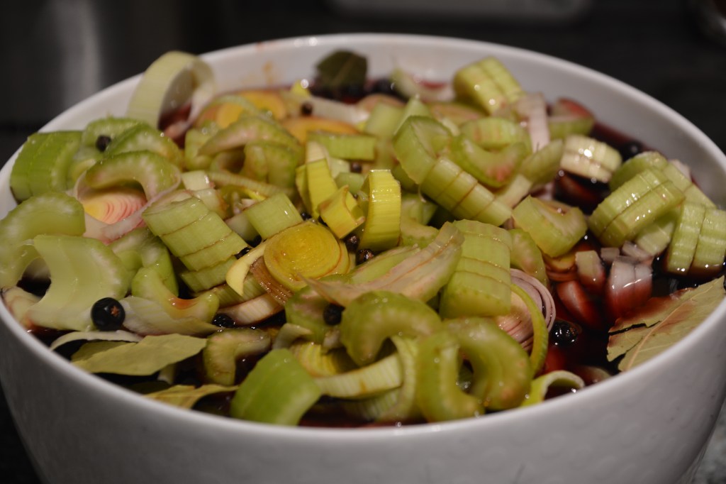 Marinade: Gemüse in kleinen Stückchen, Wacholderbeeren, Lorbeerblätter, Fleisch – im Rotwein -Essig mind. 1 Tag durchziehen lassen