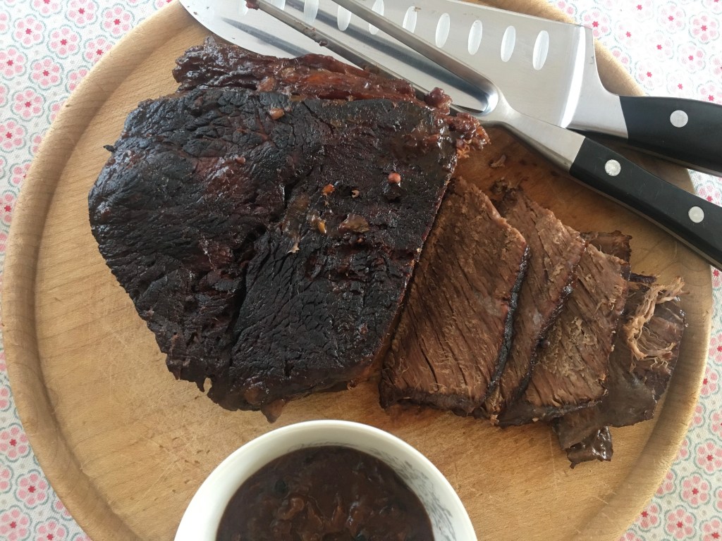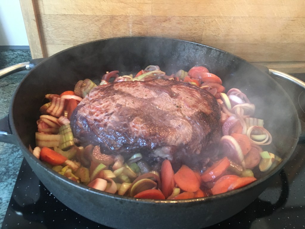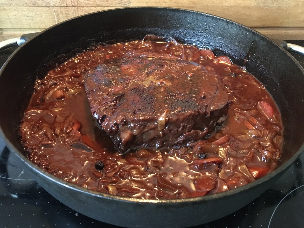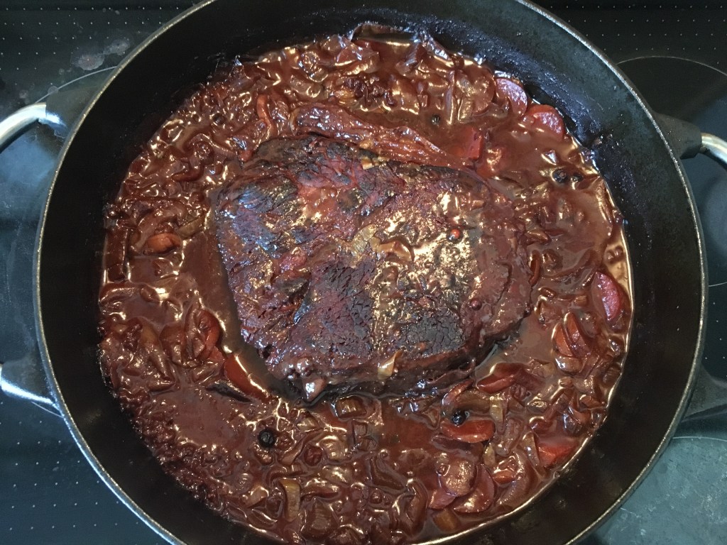 Schmoren bei 180 g zuerst 1 Stunde, dabei wiederholt die Marinade-Find-Mischung begießen, bis diese nicht aufgebraucht ist. Schokolade und Pumpernickel dazu geben und noch 1,5 Stunden schmoren lassen