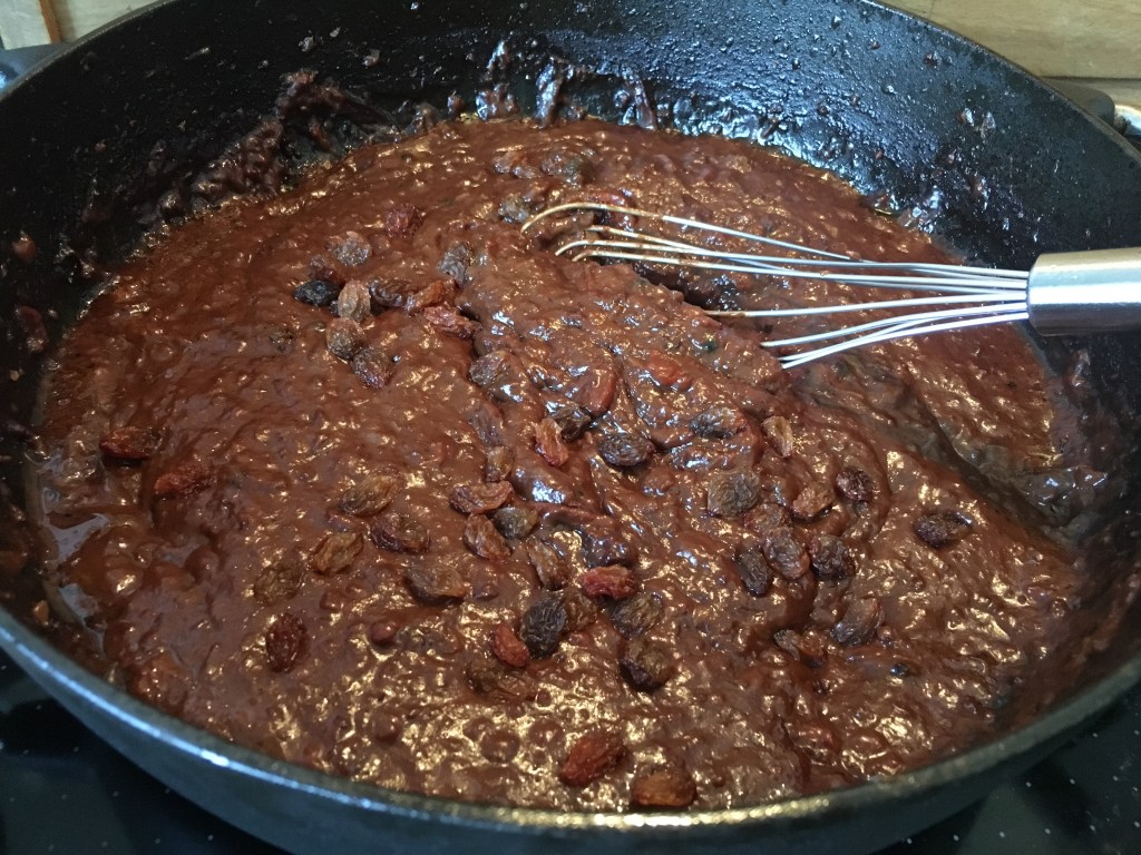 Fertigstellen: die Soße pürieren, Rosinen dazu geben, aufkochen