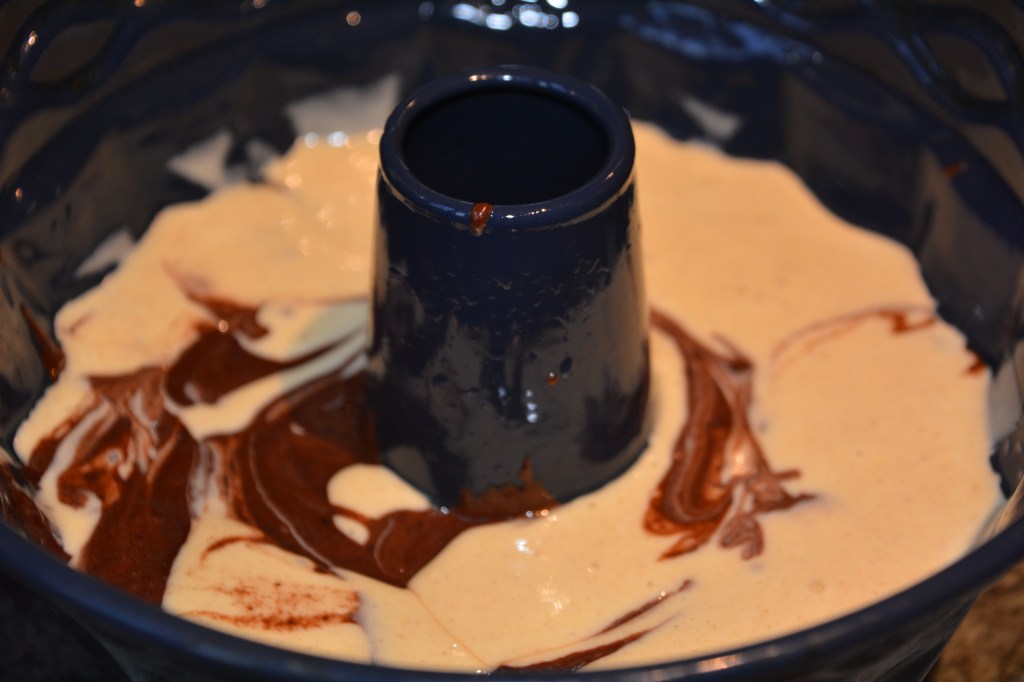 Zutaten: 300 g Butter, 300 g Zucker, 4-5 Eier (300 g), 300 g Mehl, 1 Päckchen Backpulver, 1 EL Kakao; die Butter mit Zucker schaumig schlagen, die Eier trennen, die Eigelbe zur Butter-Zucker-Mischung geben, erneut aufschlagen, das Mehl mit dem Backpulver darüber sieben, kurz untermischen, das Eiweiß steif schlagen und die Masse rühren und sie zu lockern. 2/3 des Teiges in die vorbereitete Form füllen, 1/3 des Teiges mit 1 EL Kakao vermischen und auch in die Form geben, mit einer Gabel vorsichtig die beiden Teig-Sorten durchziehen damit danach das schöne Marmor-Muster entsteht. 45 Minuten bei 160 Grad Umluft backen.