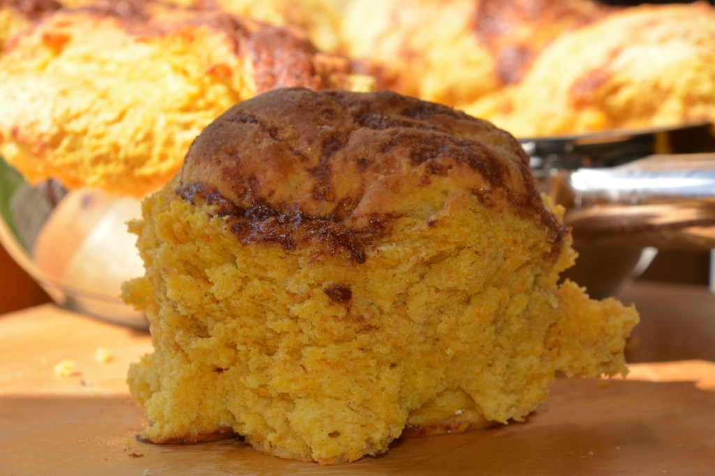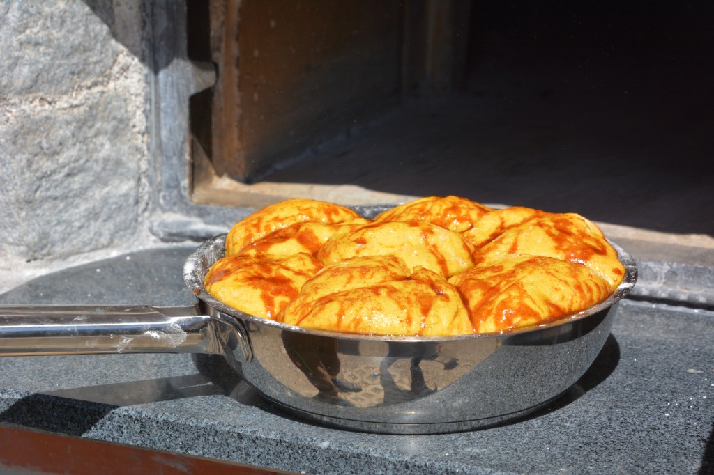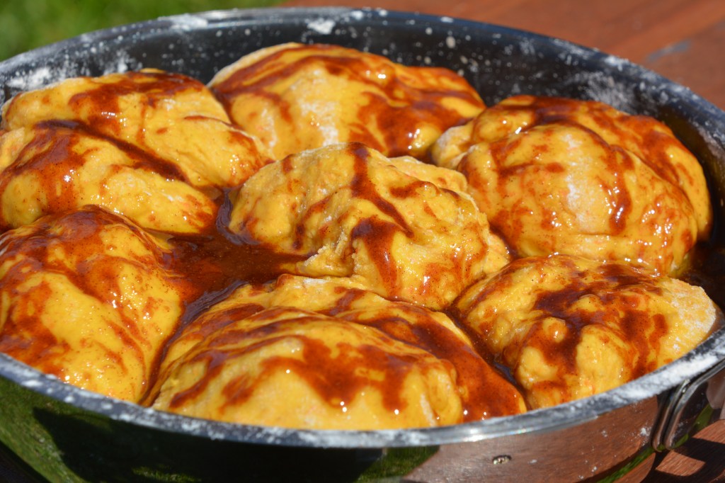 Möhren mit 50 g Butter 20 min dunsten, pürieren. Ein Hefeteig aus Möhren-Püree, Mehl, Butter 50 g, Zucker, Ei, Hefe vorbereiten, 1 Stunde gehen lassen. Mehrere kleine Bällchen aus dem Teig formen, in eine Form nah zueinander liegen, mit Lösung aus 50 g Butter, Honig, Zimt, Kardamom begießen, noch 15 Minuten gehen lassen, im vorgeheizten Holzofen bei 150 Grad 45 Minuten backen