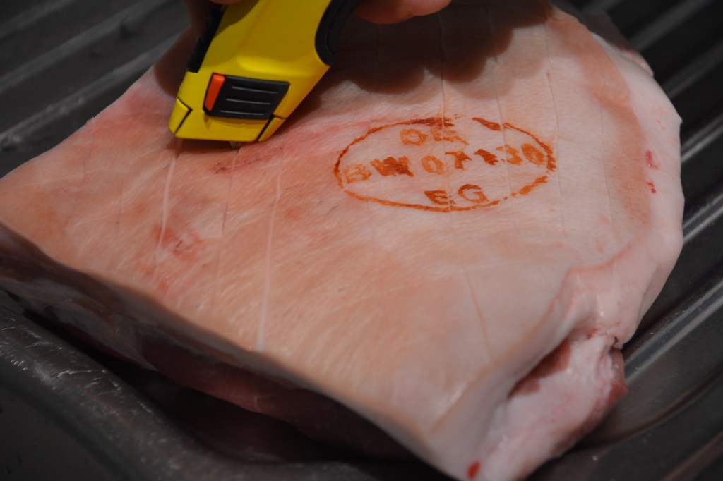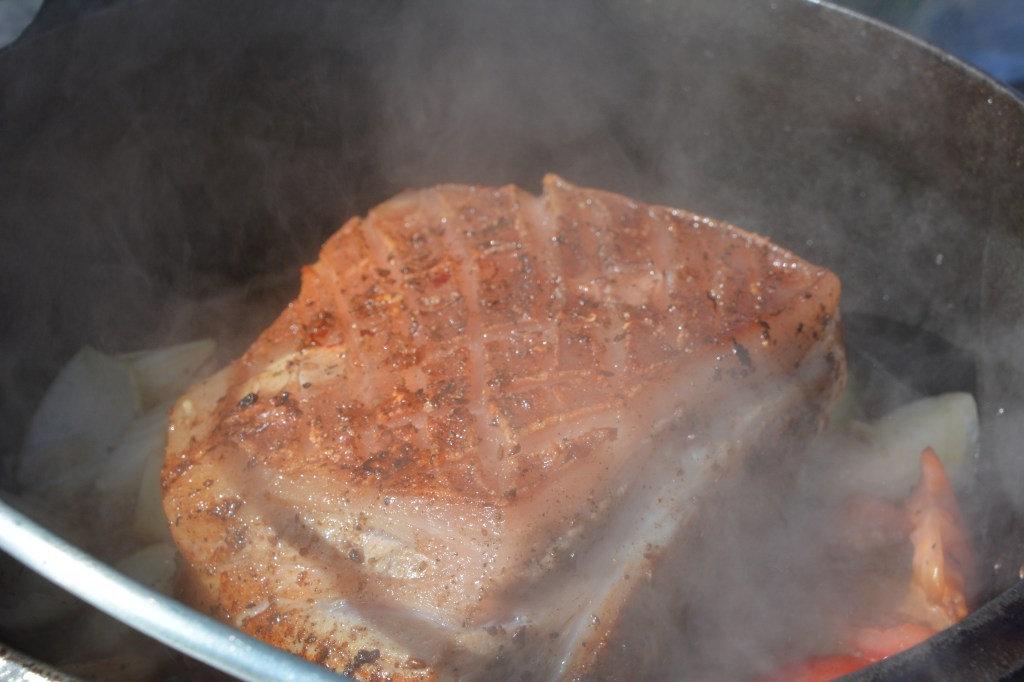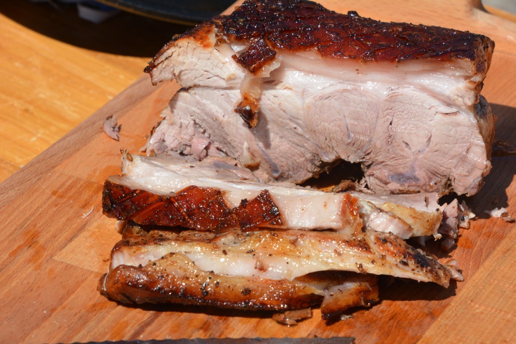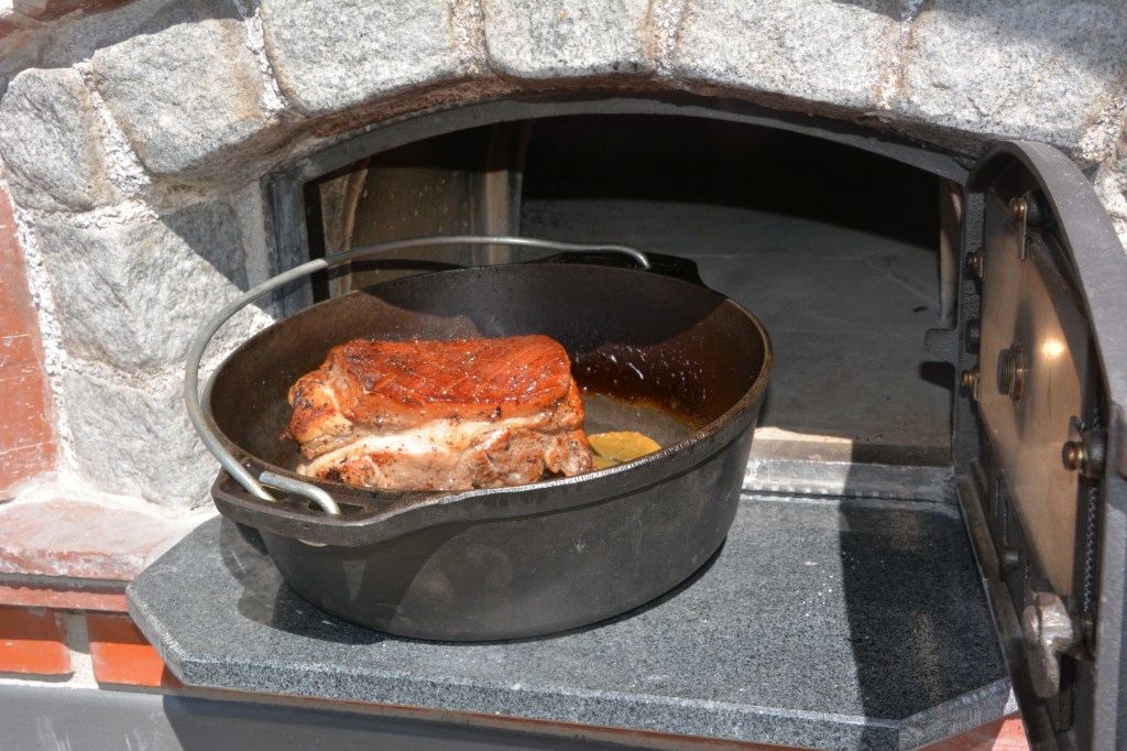 Am Abend die Schwarte mit scharfem Messer anschneiden, das Fleisch marinieren (die Zutaten einreiben). Am nächsten Tag das Fleisch und das Gemüse anbraten, im vorgeheizten Holzofen bei 150 Grad 1,5 Stunden schmoren lassen (mit Deckel), 30 min – ohne Deckel, immer wieder die Bier-Honig-Lösung über das Fleisch gießen
