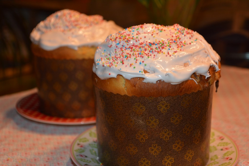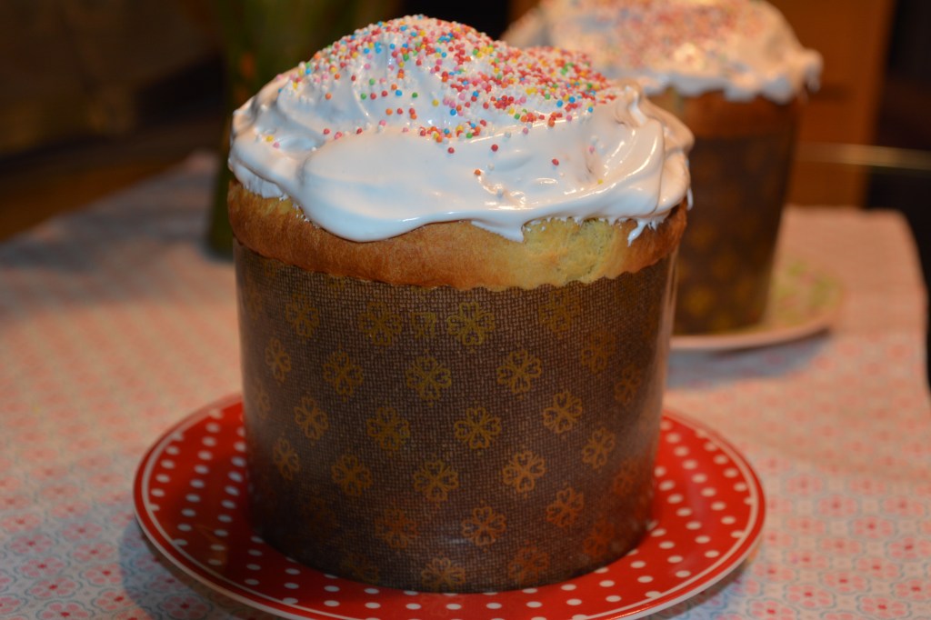 Hefeteig: Mehl, Eier, Butter, warme Milch, Buttermilch, Sahne, Zucker, Öl, Hefe zusammen kneten lassen (10-12 Minuten), aufgehen lassen (ca. 2 Stunden), Früchte dazugeben, erneut kneten, erneut aufgehen lassen (30 Minuten), Teig in die Formen füllen (2/3 der Form), erneut aufgehen lassen (30 Minuten), 35 Minuten im vorgeheizten Ofen 180 Grad Umluft backen. Noch heißen Kultisch mit Eischnee dekorieren 🙂
