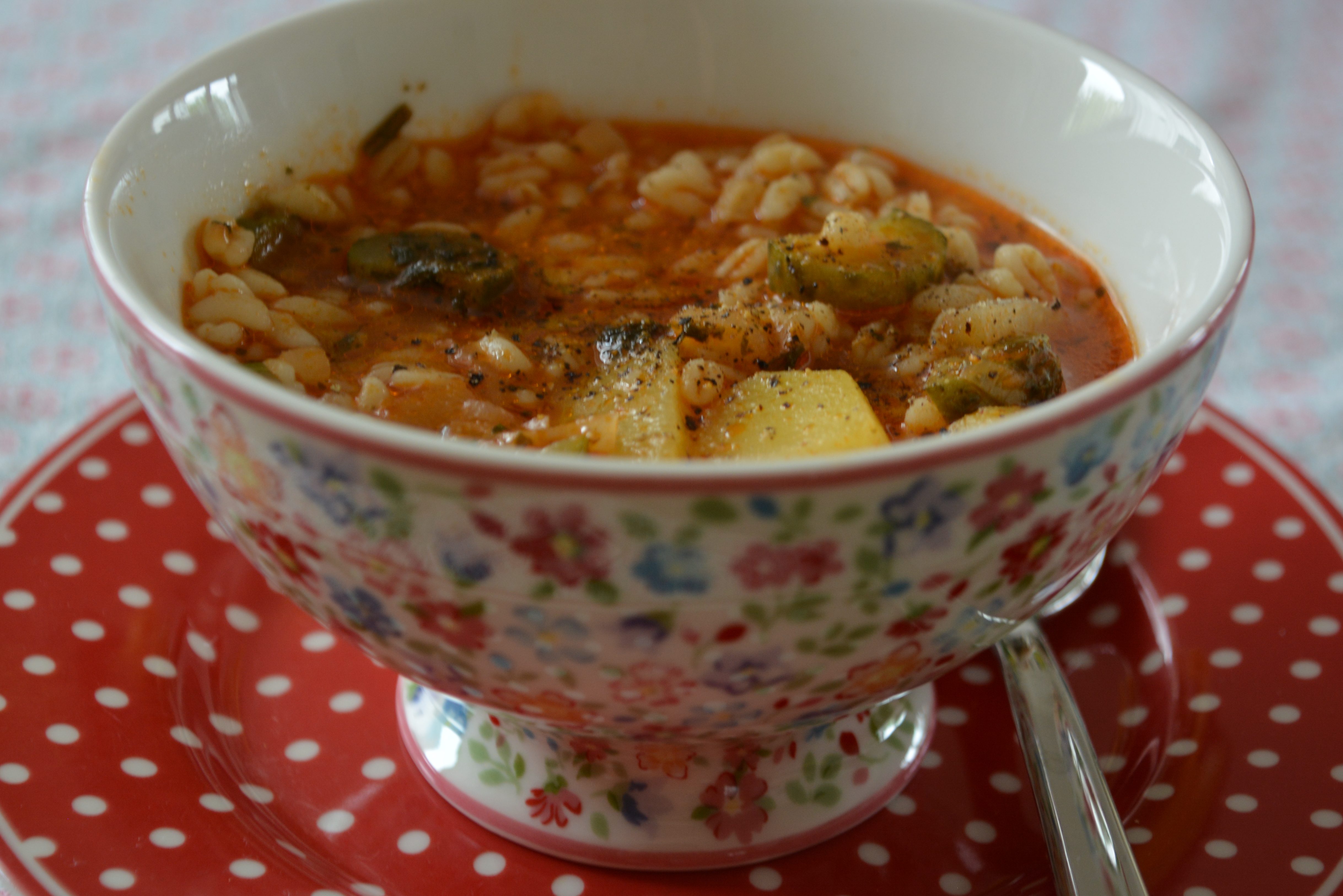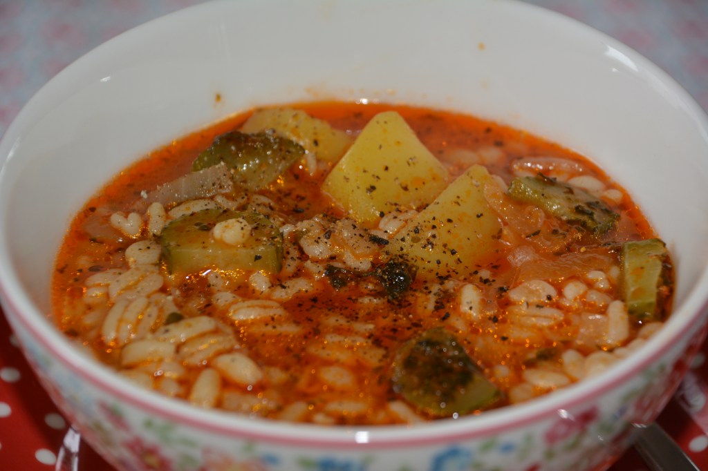 Zutaten: 100 g Essiggurken, 150 g Kartoffeln, 100 g Zwiebeln, 2 EL Tomatenmark, 150 g Goldweizen (ich hatte Ebly), Salz, Pfeffer, Petersilieblätter etwas, Lorbeerblätter 2 St.