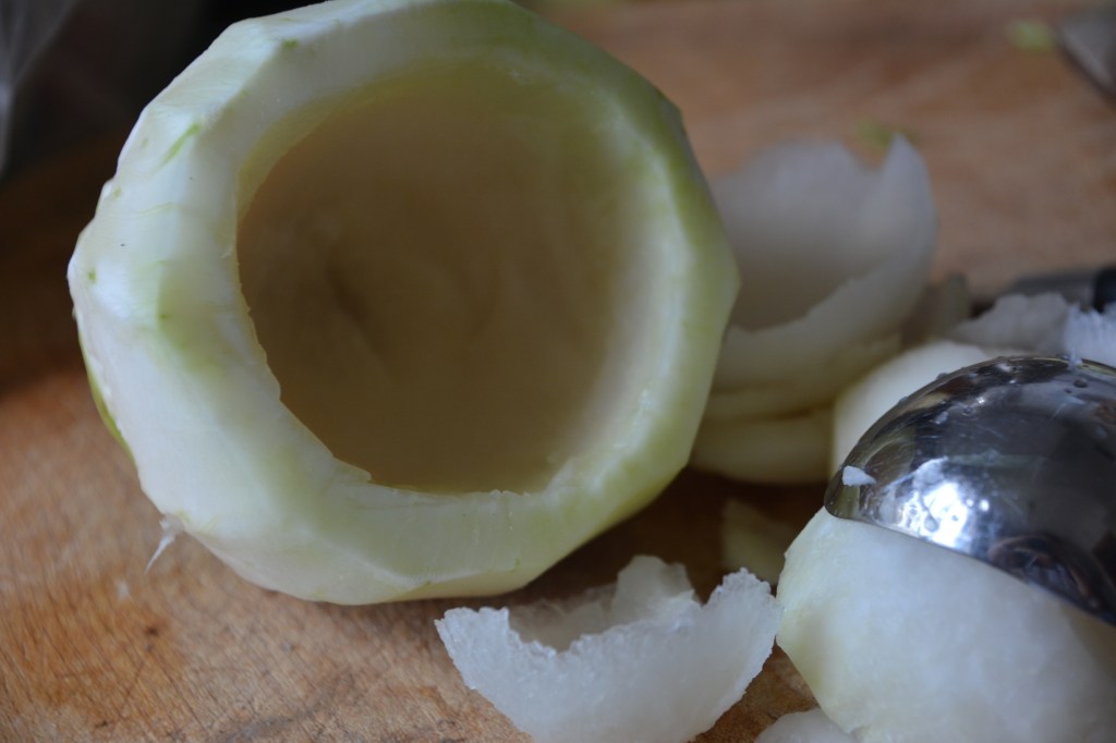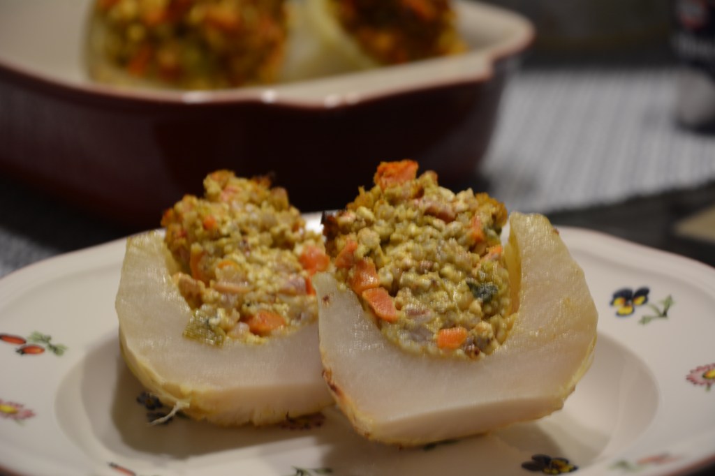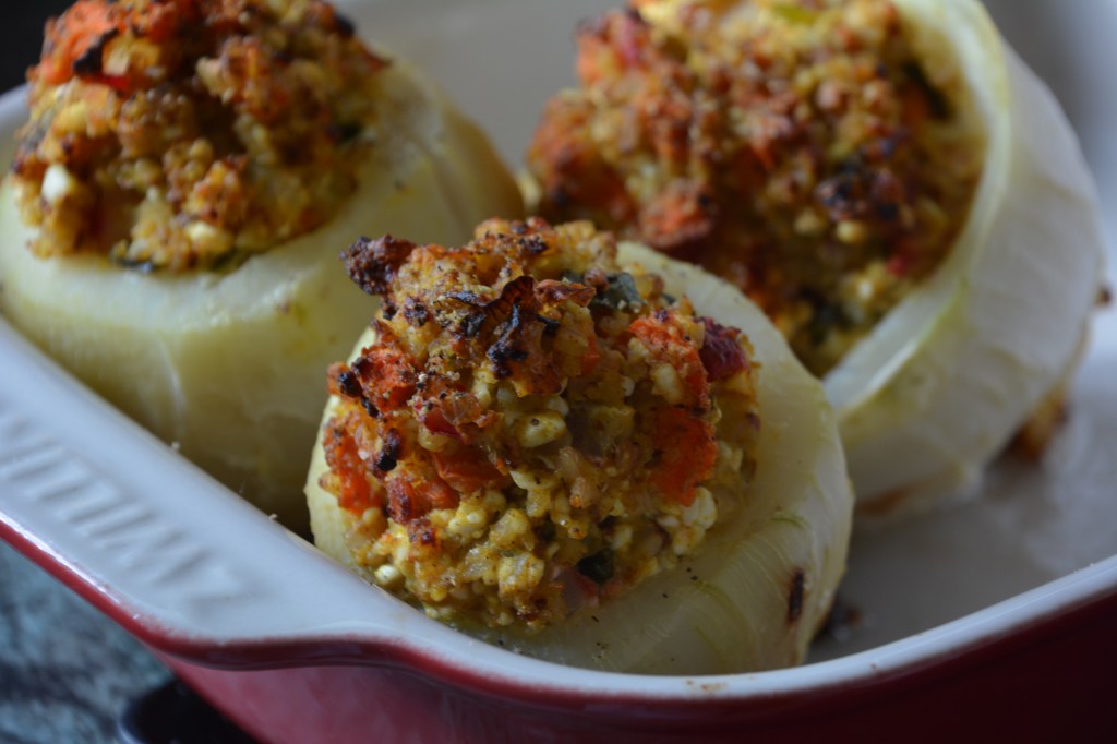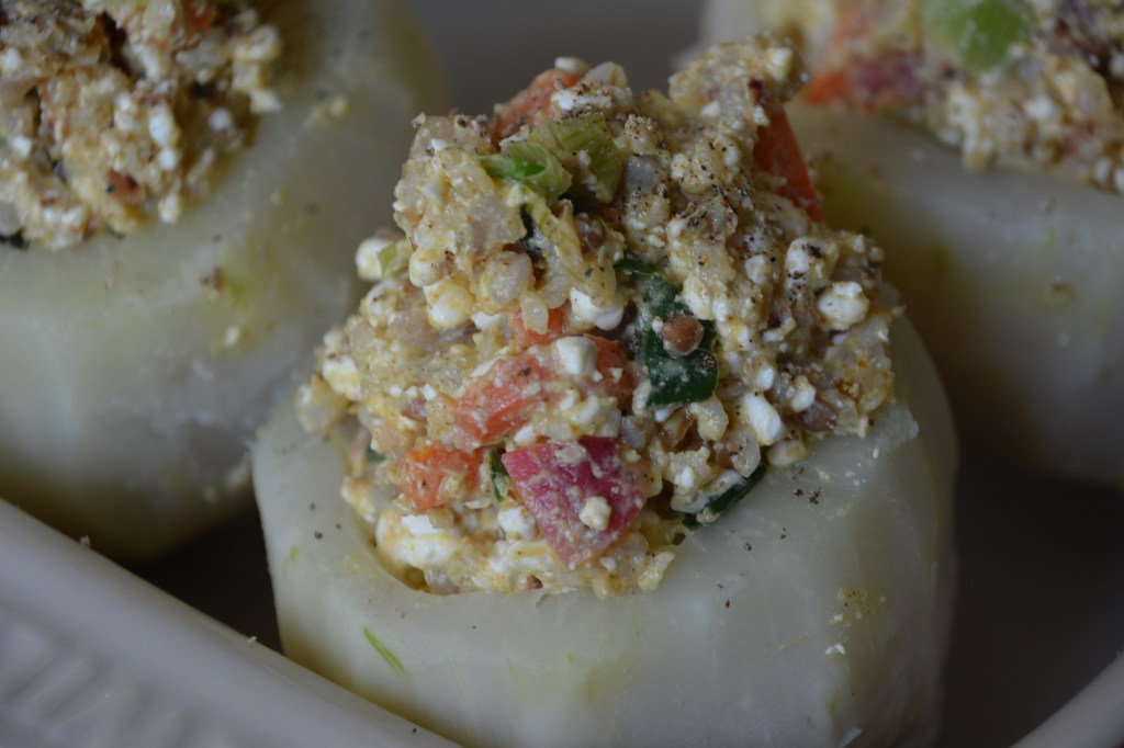 Buchweizen 15 Minuten weich kochen, alles Gemüse schneiden und im Öl andünsten. Buchweizen, Käse, Gemüse zusammen mischen, mit Gewürzen abschmecken. Kohlrabi-Knollen bis auf ca. 1 cm breiten Rand aushöhlen und 30 Minuten in Salzwasser köcheln. Ofen vorheizen (200 Grad, Umluft). Kohlrabi mit dem Buchweizen-Mix füllen, in einer Auflaufform 30 Minuten backen.