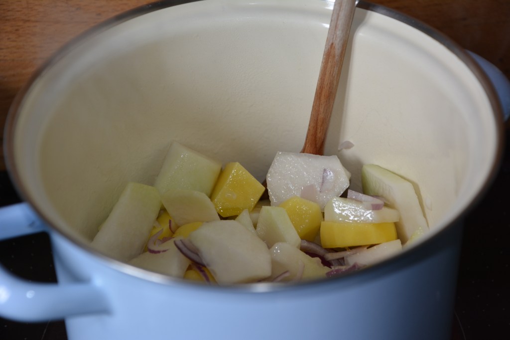 Zutaten: 2 mittelgroße Knollen Kohlrabi, 300 g Kartoffeln, 2 Zwiebeln, 300 ml Gemüsebrühe, 2 EL weiße Essig, Salz, Pfeffer, Öl, 100 ml Sahne