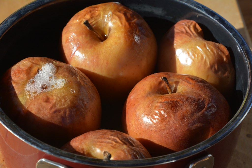 Zutaten: frische Äpfel 1 Stunde im vorgeheizten Holzofen bei 120 Grad backen.