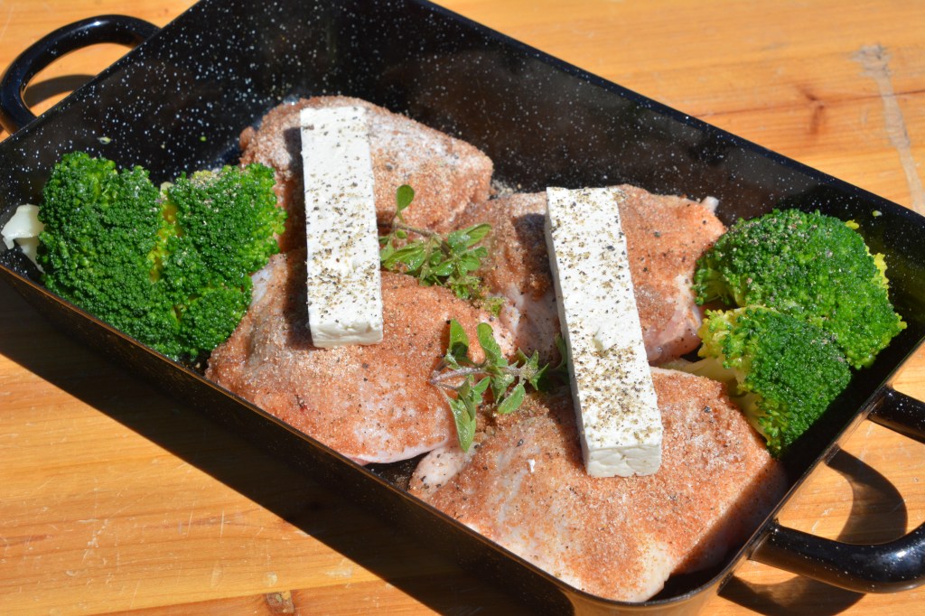 Zutaten: 4 Hähnchen-Schenkel, Weizengrieß (aus eigenem Anbau), Öl, etwas Feta-Käse, Salz, Pfeffer