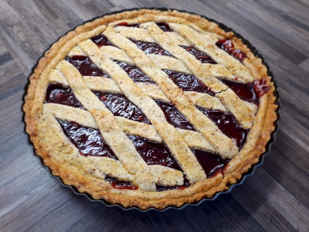 Zutaten: Teig: 200 g Mehl, 100 g gemahlene Nüsse (z.B. Haselnüsse, Mandeln), 100 g Zucker, 1 Prise Salz, 2 Msp. Zimt, 1 Ei, 130 g Butter; Füllung: 400 g Fruchtaufstrich (Himbeere oder Johannisbeere), 1 Spritzer Zitrone; für den Glanz: 1 Eigelb, 2 EL Milch; für die Backform: etwas Butter