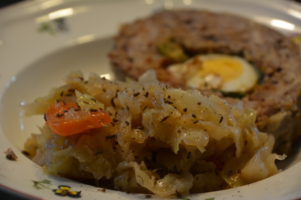 Zutaten: 1 Kopf Weißkohl, 3 Möhren, 2 Zwiebeln, Salz, Pfeffer, Kümmel, 2 Lorbeerblätter, Öl (Olivenöl), 100 ml Weißwein