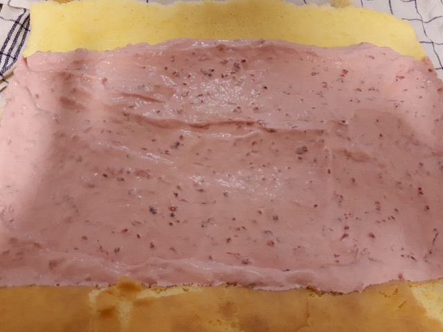 - Himbeer-Sahne gleichmäßig auftragen, ebenfalls die letzten 5cm nicht einstreichen