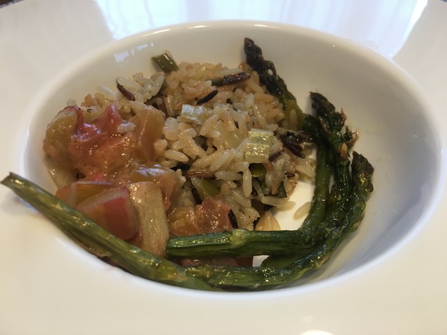 Zutaten: 250 G Risotto-Reis, 100 g Butter, 100 ml Weißwein, 4 Knoblauchzehe, 4 Stangen Lauch, 3 Stangen Rhabarber, 500 g Spargel, 300 ml Brühe, 300 g Parmesan, Salz, Pfeffer, Nelken, Lorbeerblätter, Limettensaft (1 Limette)
