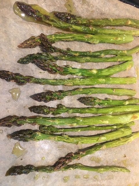 Spargel mit Olivenöl und Salz auf Backpapier 20 Minuten im Ofen (180 Grad Umluft) backen, zum Risotto noch warm servieren.