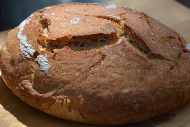 Alle Zutaten zum Teig zusammen kneten, 24 Stunden reifen lassen, das Brot im vorgeheizten gusseisenen Topf bei 230 Grad im Holzofen 45 Minuten backen