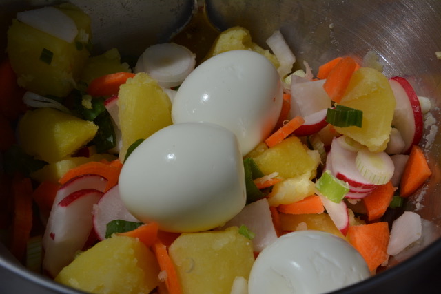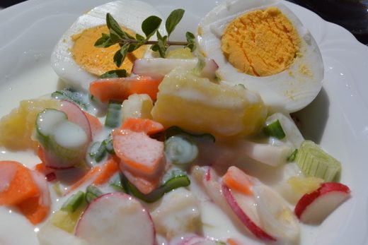 Zutaten: 3 Kartoffeln, 2 Stangen Lauch, 2 Karotten, 7 Radieschen, 1 Rettich, 3 Eier, 500 ml Buttermilch, Salz, Pfeffer