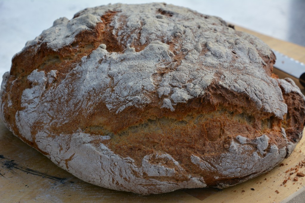 Zutaten: 500 g Mehl (Gemischt Roggen, Weizen, Dinkel, aus eigenem Anbau), 100 ml Wasser, 20 g Hefe, Salz; Hefeteig brauch ca. 2 Stunden, in dieser Zeit verdoppelt sich das Volumen; im vorgeheizten Holzofen bei 230 Grad 50-60 Minuten backen