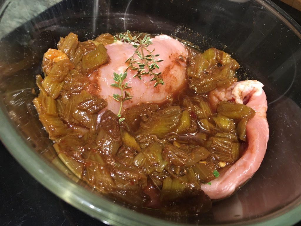 Zutaten: 600 g Rhabarber, 100 ml Rotweinessig, 3 EL Zucker (ich hatte Waldhonig), 1/2 EL Chiliflocken, 1 TL Zimt, Thymian, 3 Hähnchen-Brustfilet; das Fleisch 8-10 Stunden marinieren lassen
