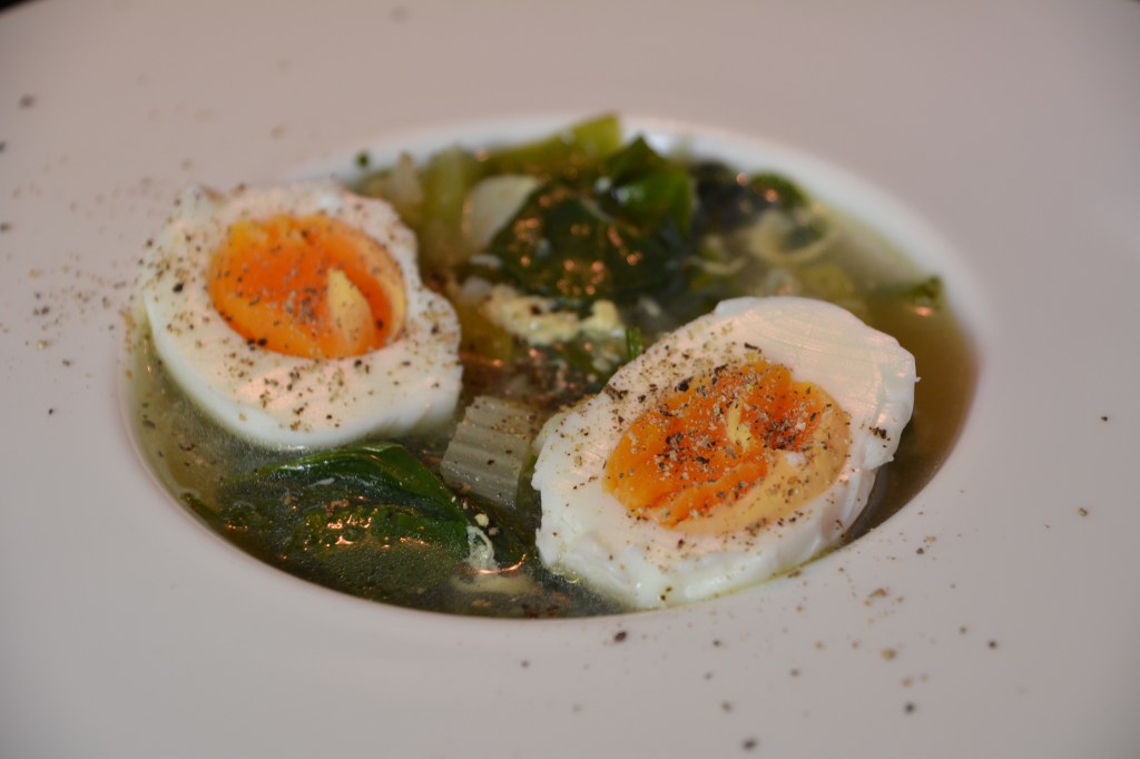 Zutaten: 1,5 L Brühe, 3 große Kartoffeln 15 Minuten in der Brühe kochen; angedünstete in Öl 5 Stangen Sellerie, 1/2 Knolle Fenchel, 1 Stange Porree in die Brühe geben, 10 Minuten langsam kochen; in die fertige Suppe 200 g Spinat untermischen, mit einem gekochten Ei servieren.