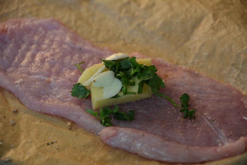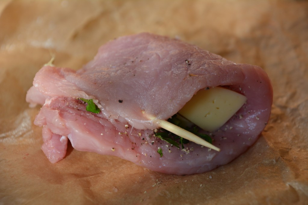 Kommentar: Ich hatte noch 2 Schweineschnitzel (gleiche Vorbereitung, gleiche Füllung, gleiche Backzeit); Hähnchenschnitzel finde ich saftiger 🙂 man kann das Gericht klassisch kochen – Schnitzel in viel Öl auf Pfanne anbraten