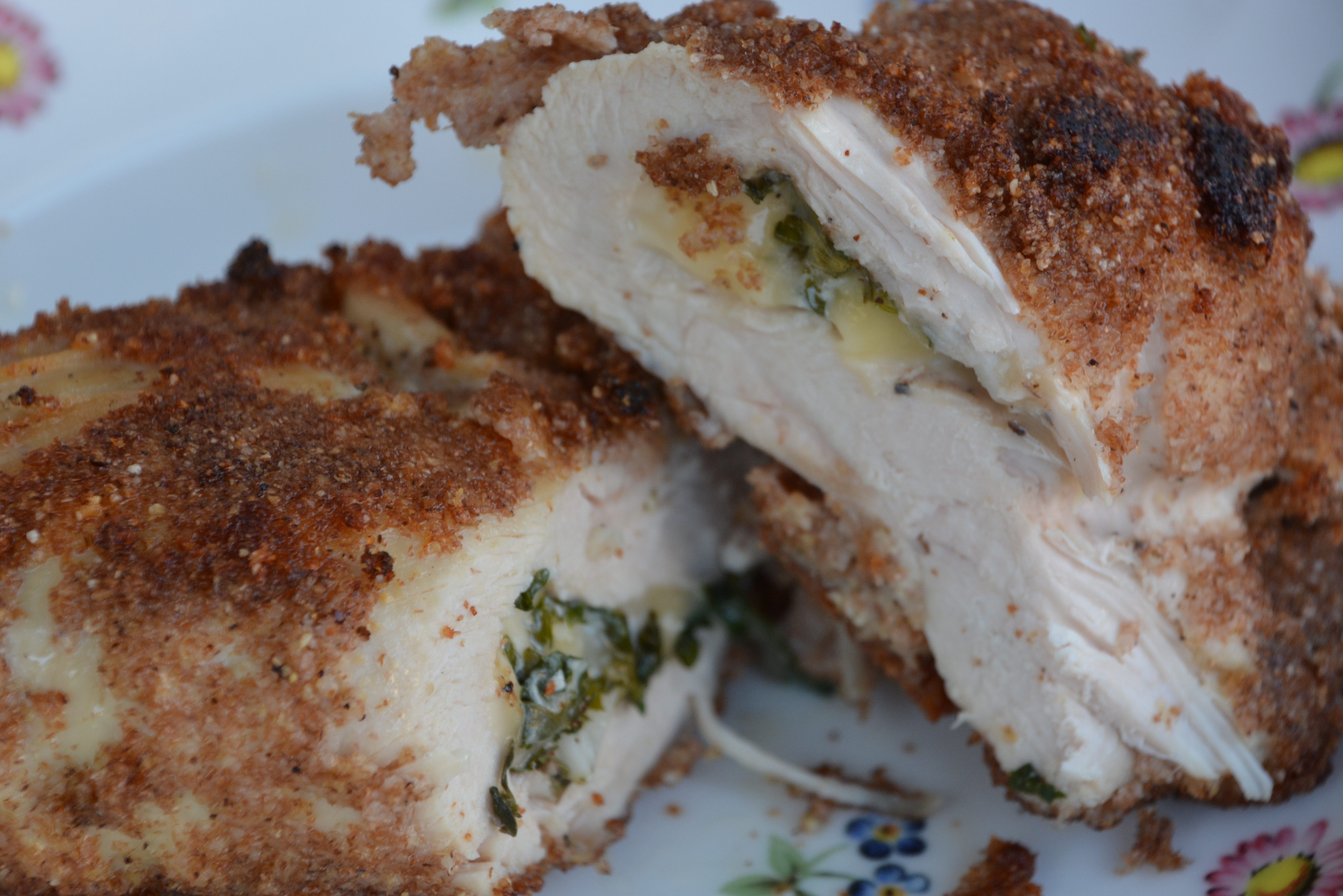 Zutaten: 2 Hähnchen-Brustfilet, Butterkäse 50 g, 2 Knoblauchzeh, Weizengrieß zum Panieren, 2 Eier zum Panieren, Kräuter beliebig (aus eigenem Anbau, Thymian, Oregano, Petersilie 🙂