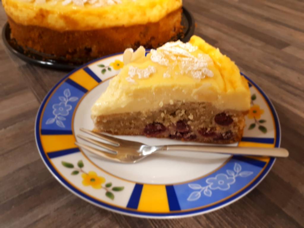 - noch 15 Minuten backen, der Kuchen ist fertig wenn man mittig auf die Creme tippen kann und nichts am Finger kleben bleibt