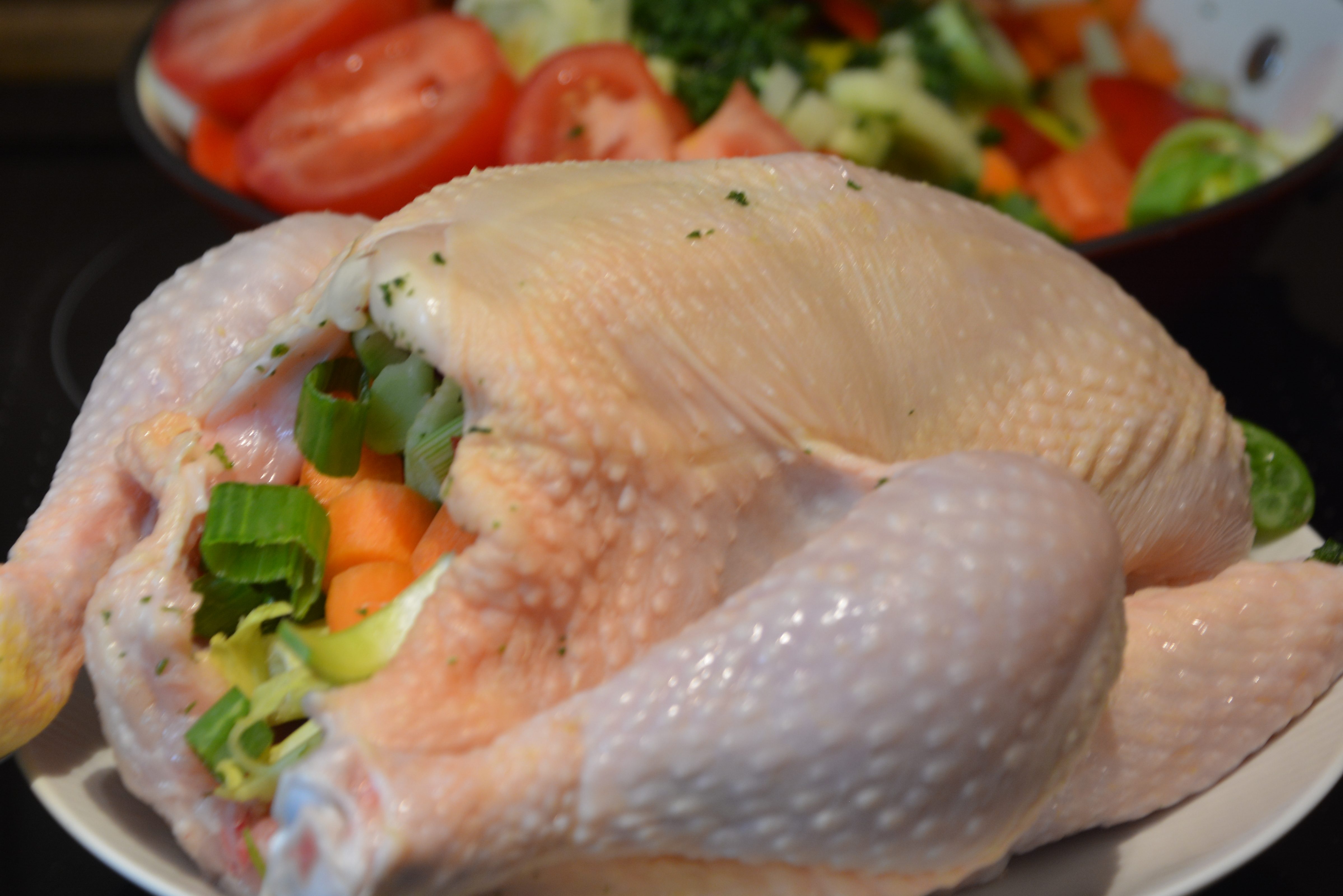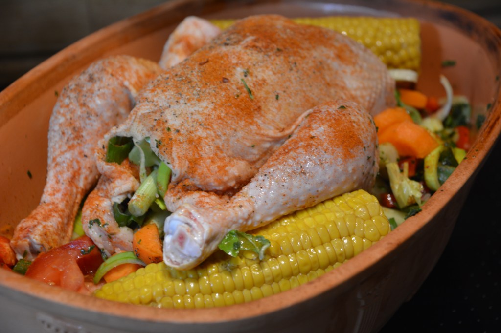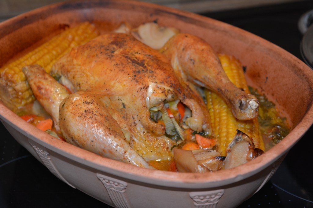 Hähnchen 1,5 kg, 2 Möhren, 1 Knolle Fenchel, 2 Stangen Sellerie, 2 Zwiebeln, 3 Tomaten, Kräuter, Lauch 2 Stangen, 1 Apfel, 2 Maiskolben, 300 ml Weißwein, Salz, Pfeffer. Der Topf 1,5 Stunden wässern. Das Hähnchen mit Gemüse füllen, die restlichen Zutaten im Topf verteilen, mit Wein übergießen, in den kalten Backofen stellen, bei 180 Grad Umluft 90 Minuten mit und 20 Minuten ohne Deckel backen.