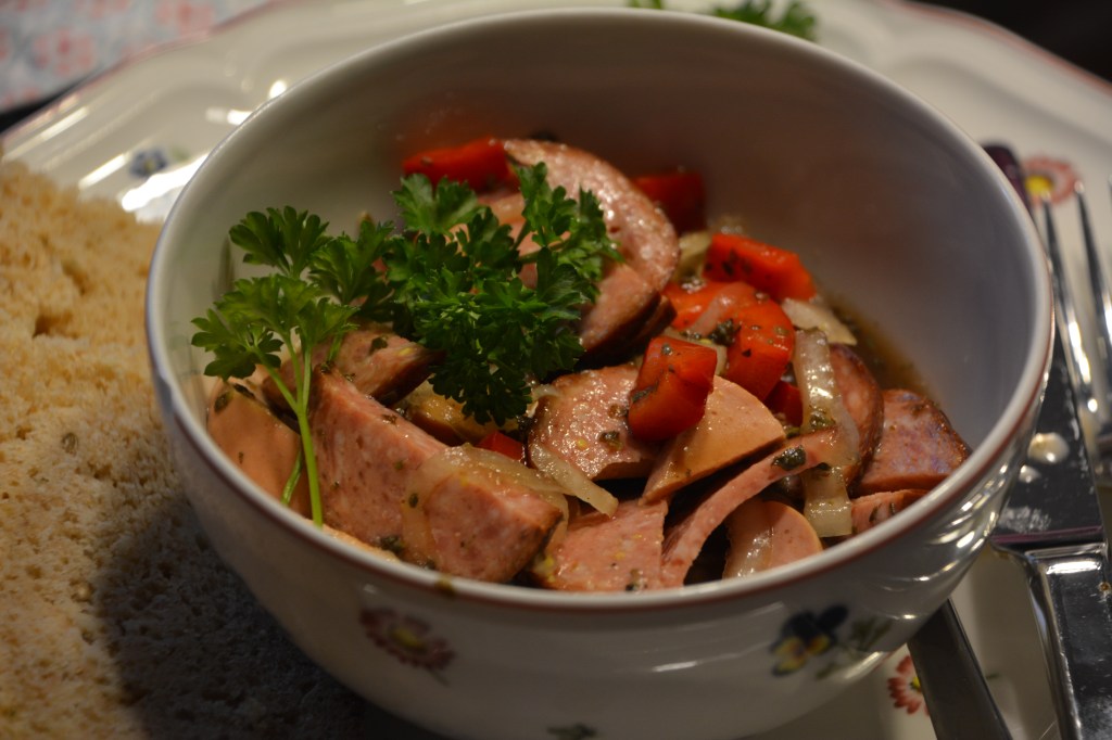 Zutaten: Fleischwurst 1/2 Ring, Blutwurst 1/2 Ring, 2 Zwiebeln, 1 Paprika, Salz, Pfeffer, Weißer Essig nach Geschmack, Olivenöl 4-5 EL, Dijon Senf 2 EL, Essiggurken 3-4 St (klein), Salzlösung aus dem Essiggurken-Glas nach Geschmack; 1 Nacht marinieren lassen