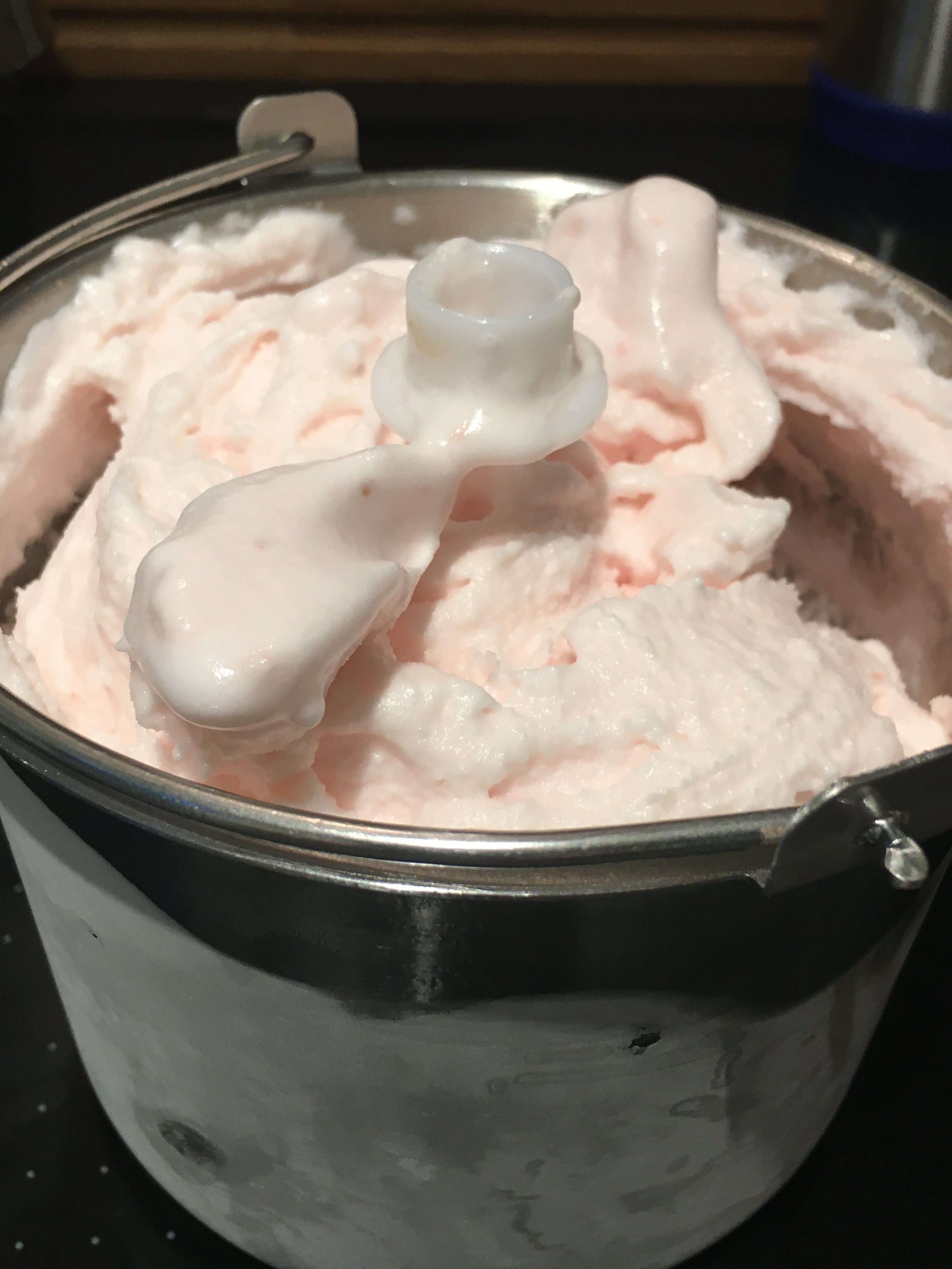 Zutaten: Saft (frisch gepresst) 1 Grapefruit, 5 EL Holunder-Sirup (hausgemacht), Eiweißschnee (2 Eiweiß und 2 EL Zucker); die Eismaschine (ich habe Springlane Elli) arbeitet 45 Minuten