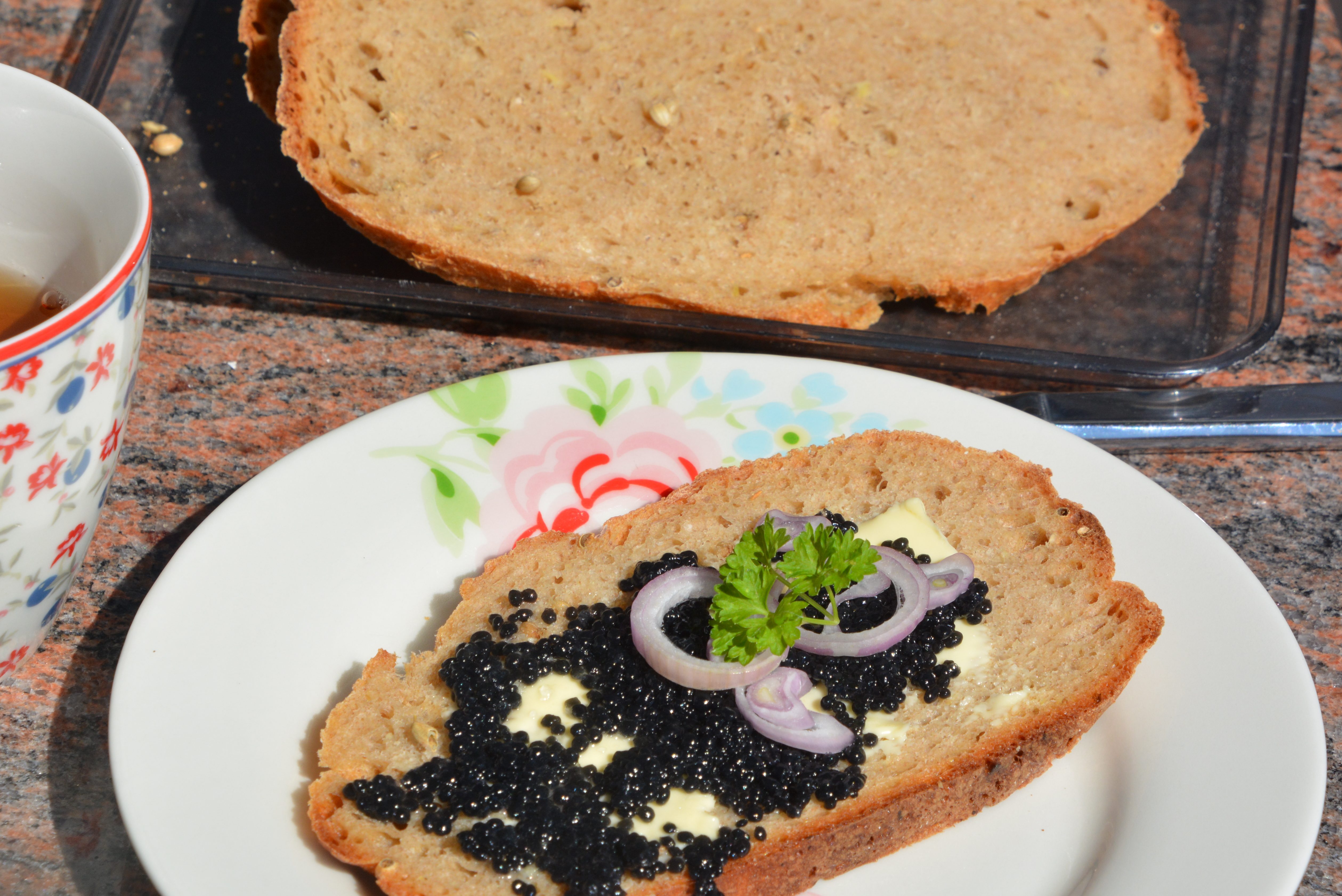 Zutaten: 585 g Mehl (Dinkel+Roggen), 205 g Wasser, 200 g Buttermilch, 12 g Salz, 0,5 g Hefe; eig mischen, 24 Stunden bei Raumtemperatur reifen lassen, alle 8 Stunden dehnen und falten, Teig formen, 1 Stunden reifen lassen, der Ofen mit dem gusseisernen Topf auf 250 Grad vorheizen, 15 Minuten bei 250 Grad und 15 Minuten bei 230 Grad backen.