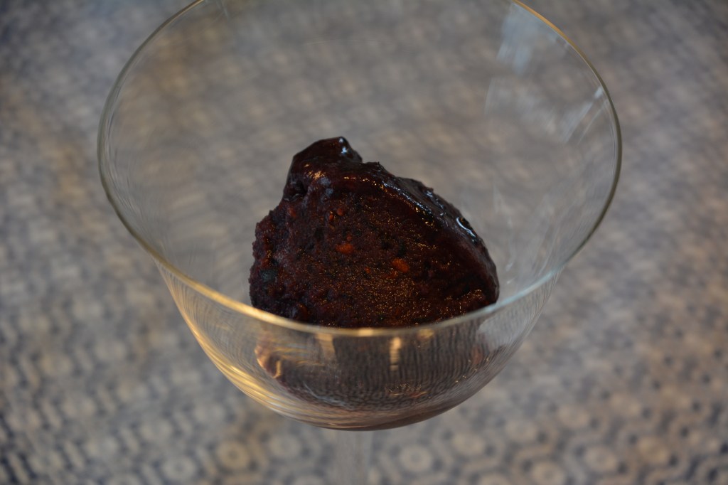 Zutaten: 125 g Brombeeren, und 200 g Blaubeeren pürieren, mit Eisschnee (2 Eiweiß, 100 g Zucker) vermischen, 50 g weißer Rum dazu geben; 45 Minuten mit Hilfe einer Eismaschine (ich besitze Springlane, Elli) einfrieren lassen