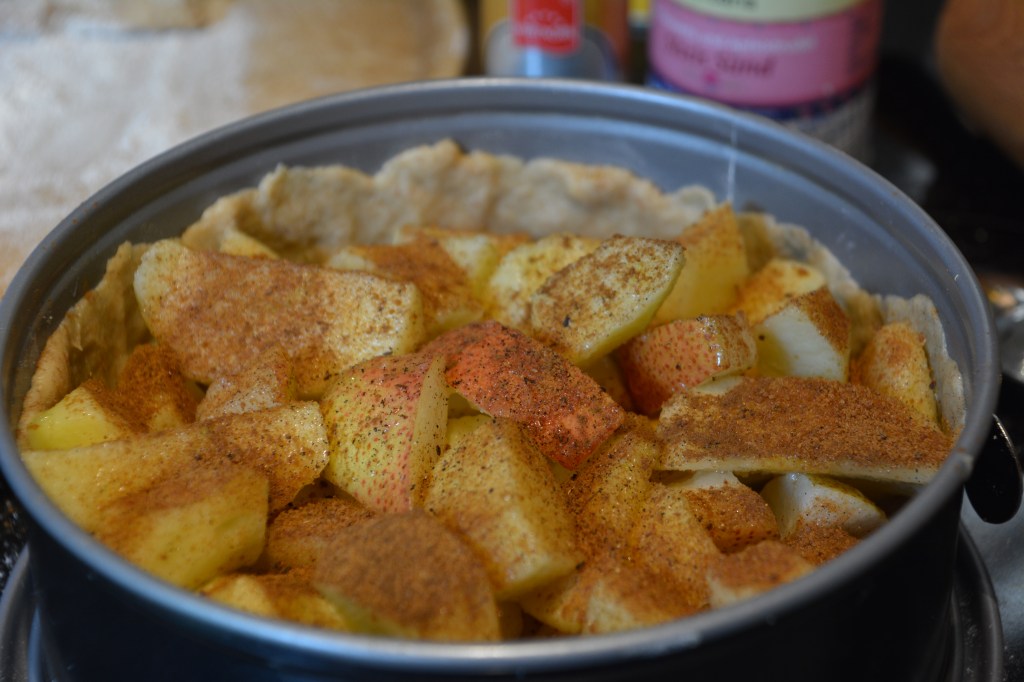 Zutaten: Teig: 370 g Mehl (ich hatte Vollkorn Dinkel), 80 g Zucker, Salz, 150 g kalte Butter, 125 ml kalte Buttermilch; Füllung 1,6 kg Äpfel, 3 Birnen, 50 g Mehl, 100 g Zucker, 1 Eck. Vanillezucker, etwas Zimt, Nelke, Muskat, Zitronensaft (frisch); zum Bestreuen: etwas Milch und brauner Zucker