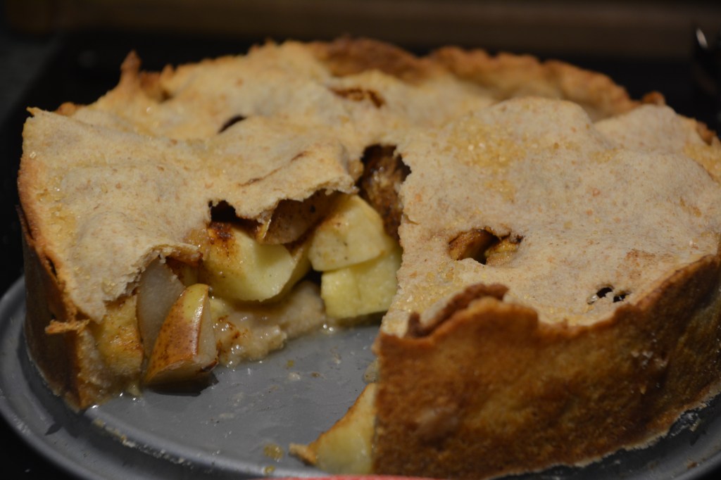 Teig: alles Zutaten verkneten, 30 Minuten kalt stellen; Füllung: Äpfel schälen, Äpfel und Birnen schneiden, mit Mehl, Zucker, Zimt, Muskat, Nelke vermischen; die Form fetten, Teig ausrollen – 2/3 für den Boden, 1/3 – für Kuchendeckel; im Kuchendeckel kleine Löcher ausstechen, der Pie mit Milch bestreichen, brauner Zucker verteilen; im vorgeheizten Backofen 45 Minuten bei 180 Grad (Umluft) backen