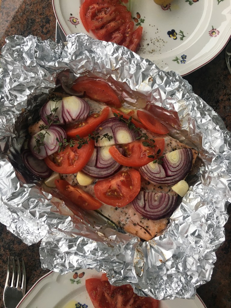 Zutaten: Lachsfilet 500 g, 1 Zitrone Saft (frisch), 2 Tomaten, 2 Zwiebeln, 1 Knoblauch, frisch, Salz, Pfeffer, etwas Olivenöl, Zweige Thymian (beliebig)