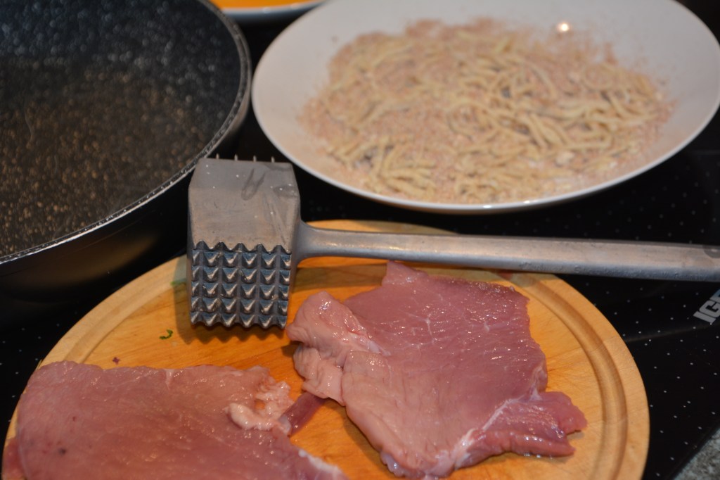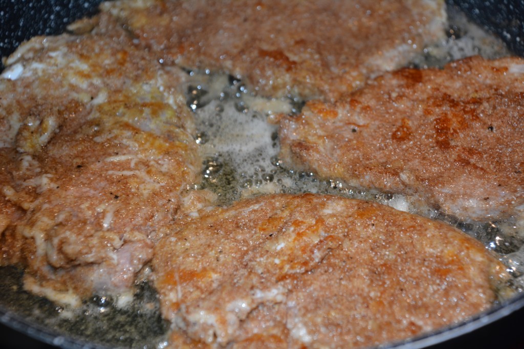 Zutaten: Schweineschnitzel platt klopfen, durch verquirltes Ei durchziehen, in einem Mix aus Semmelbröseln, geriebenem Käse (ich hatte Parmesan und Mozzarella), Salz, Pfeffer panieren, in Öl anbraten