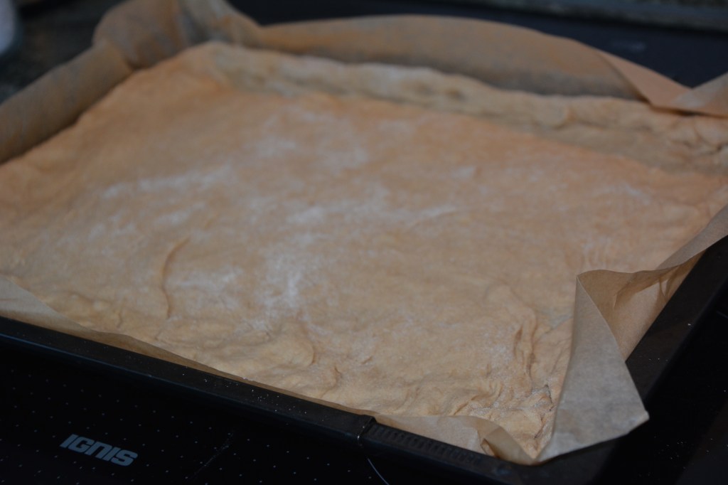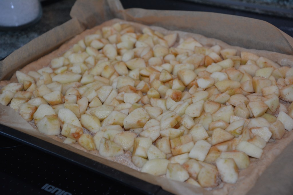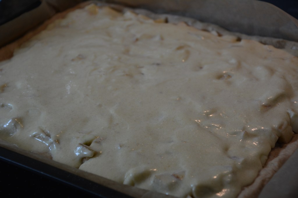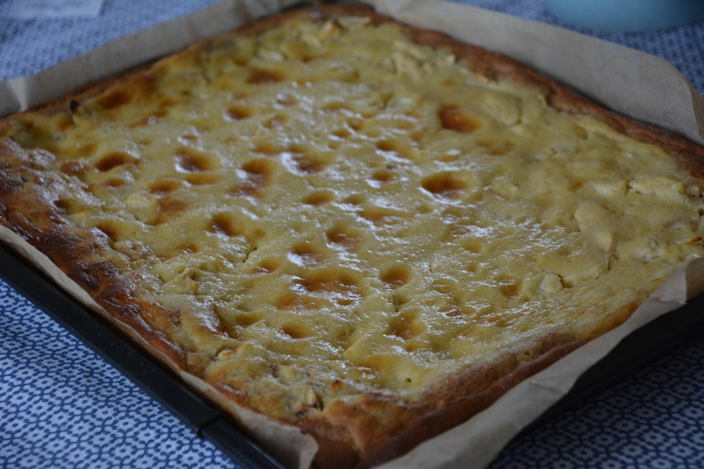 Zutaten: Hefeteig 2 Stunden reifen lassen: 375 g Mehl (ich hatte Vollkorn Dinkel), 60 g Zucker, Salz, 50 g Butter, 20 g Hefe, 1/8 Milch, 1 Ei; Belag: 50 g Weizengrieß, Äpfel beliebig viel auf dem Teigboden verteilen; Guß: 3/8 Milch mit 50 g Mehl in einem Topf verquirlen und aufkochen lassen, danach abkühlen lassen, zusammen mit Salz, 1 Pck Vanillezucker, 100 g Zucker, 90 g Butter, 2 Eier aufschlagen; im vorgeheizten Ofen bei 180 Grad Umluft 1 Stunde backen