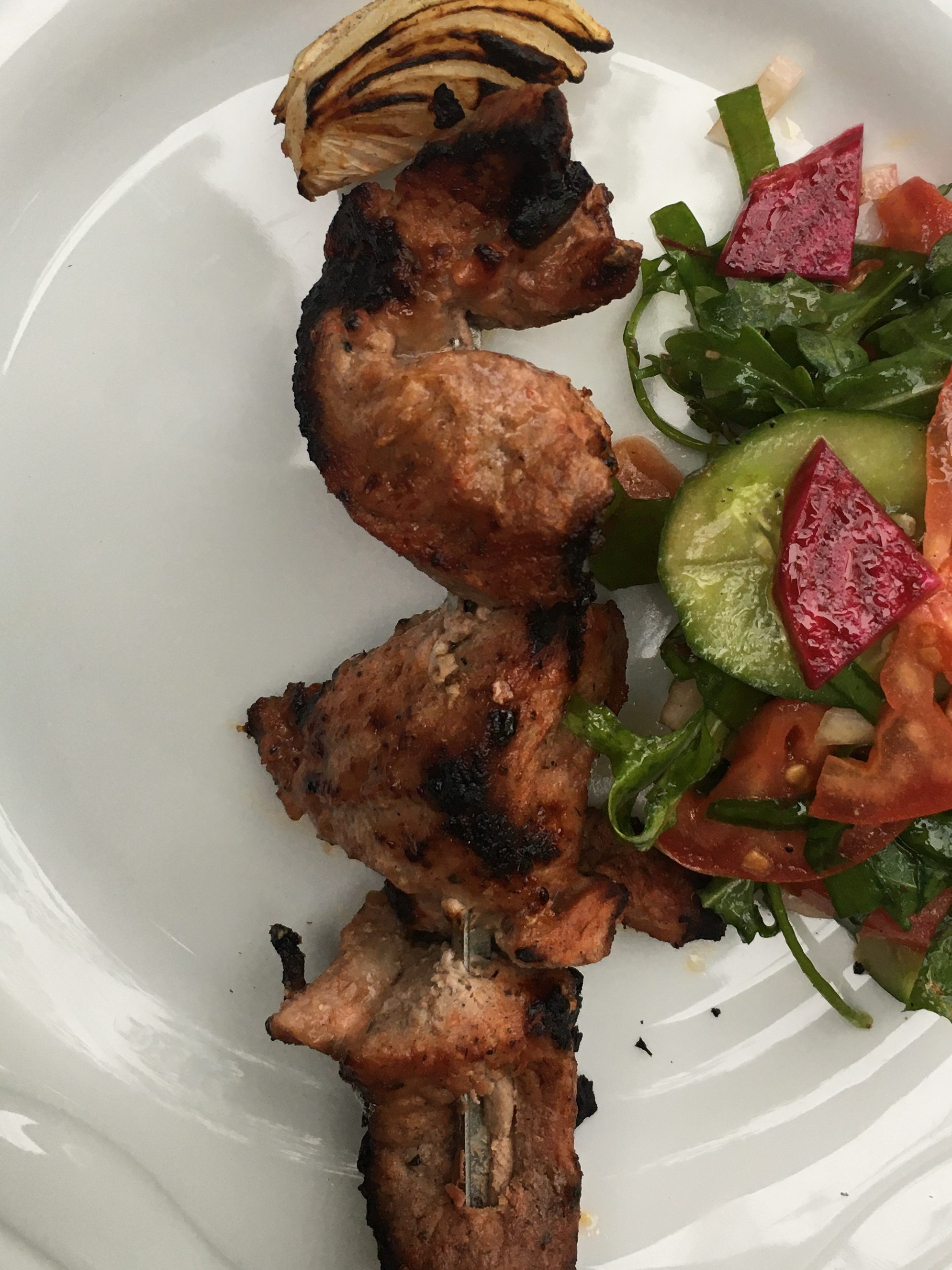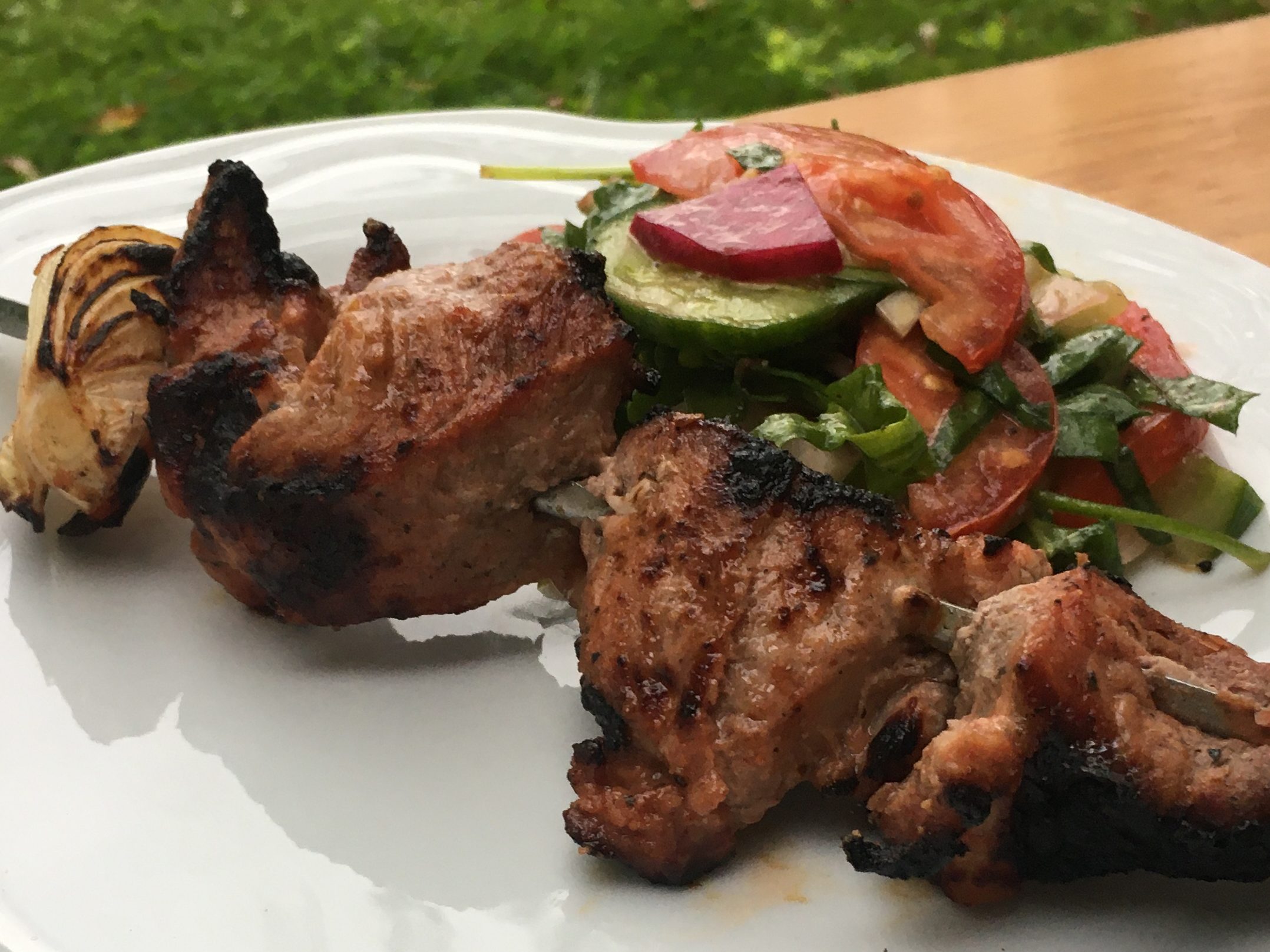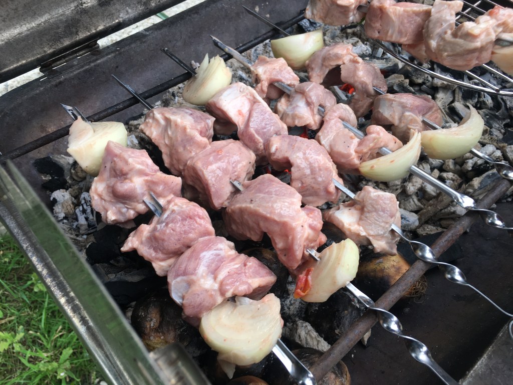 Zutaten: 1 kg Schweinefleisch (Hals), 1 kg Zwiebeln, 1 Dose pass. Tomaten, 1 l Kefir, Salz, Pfeffer, beliebig viel – klassisch Petersilie (ich hatte Rucola), Saft 1 Zitrone; marinieren mindestens 24 Stunden