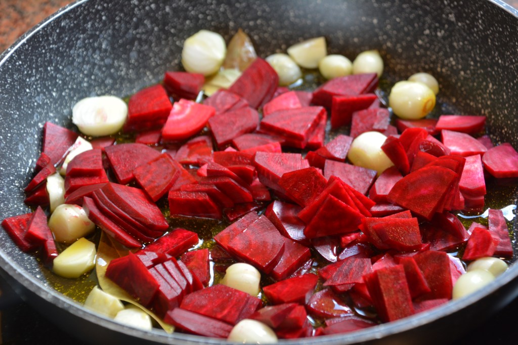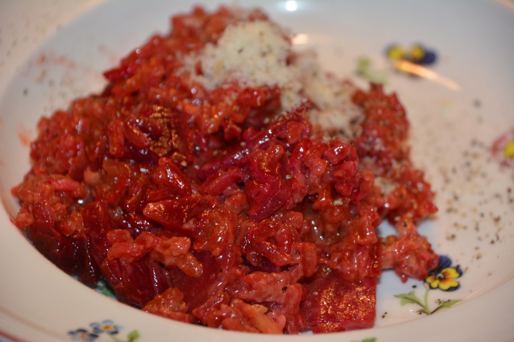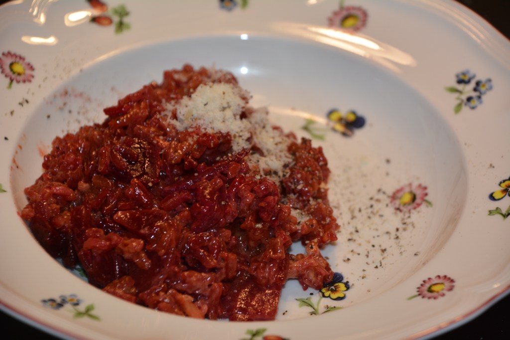 Zutaten: 250 G Risotto-Reis, Rapsöl, 100 g Butter, 100 ml Rotwein, 2 Knoblauchzehe, junge Zwiebeln (aus eigenem Anbau), 4 frische Rote Bete (aus eigenem Anbau), 500 ml Brühe, 300 g Parmesan, 100 ml Sahne, Salz, Pfeffer, Nelken, Lorbeerblätter