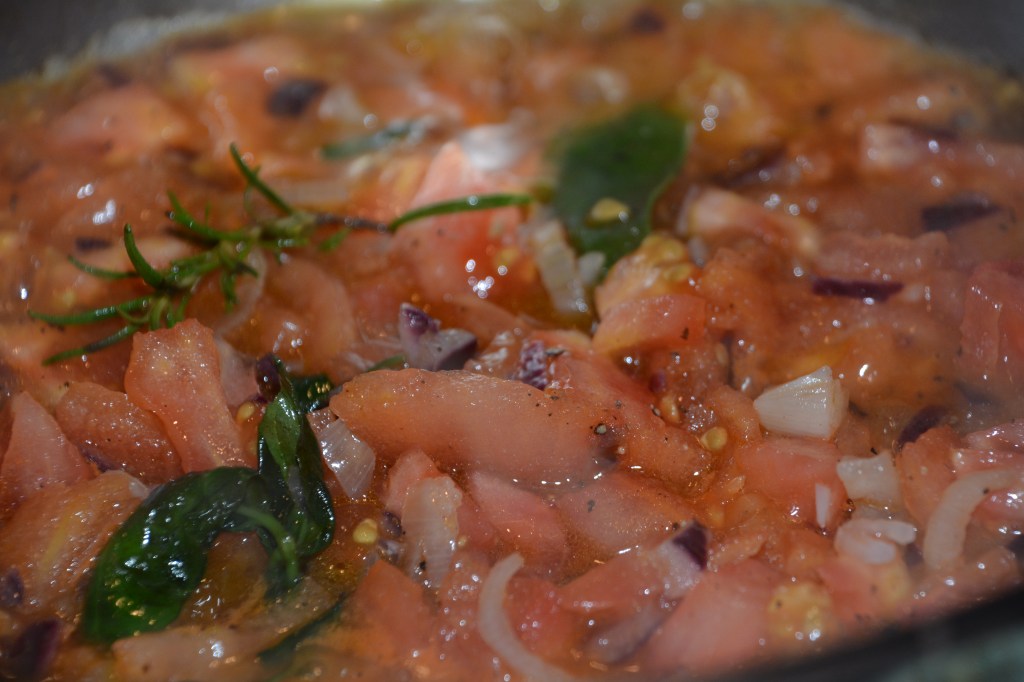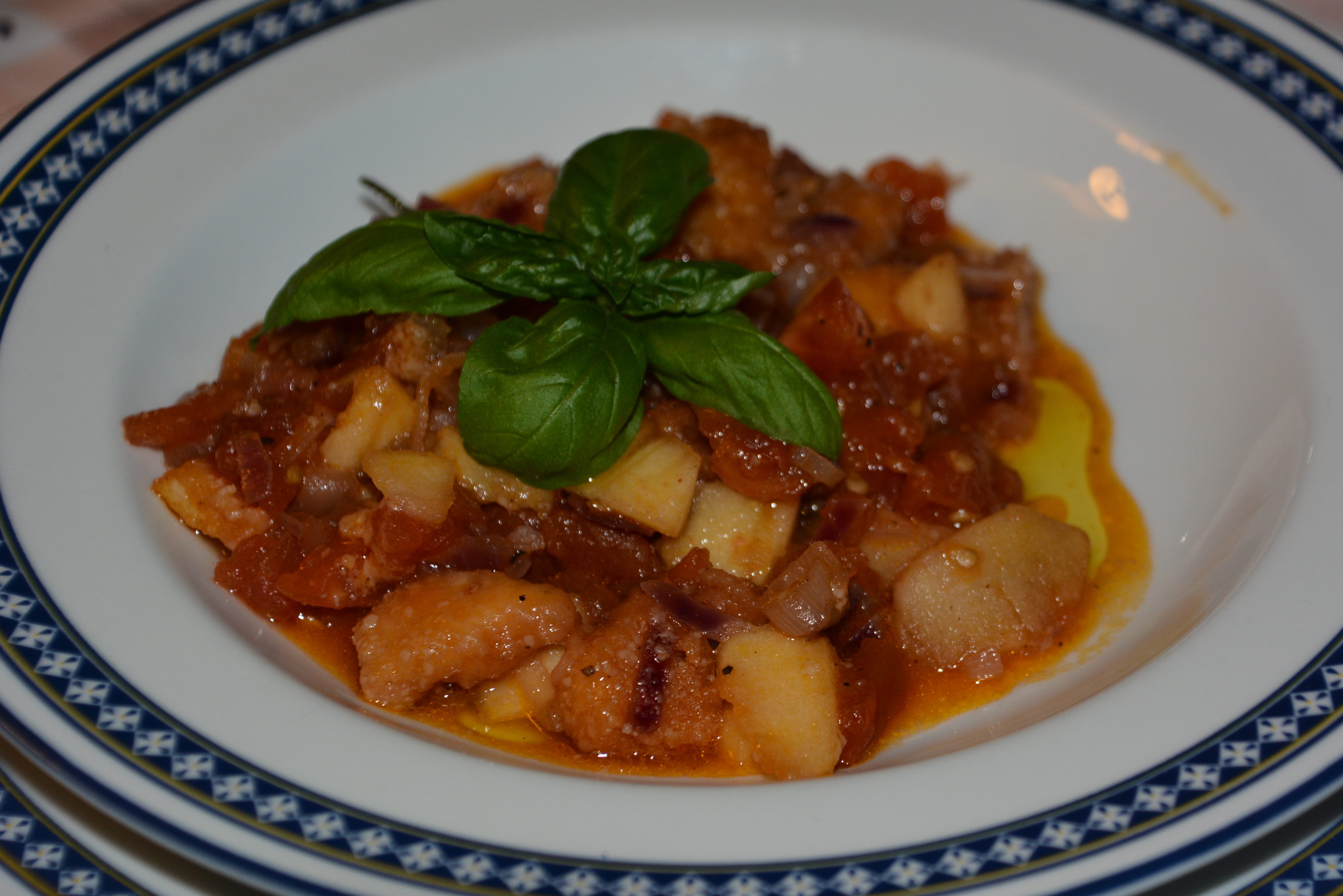 Zutaten: 1 kg Tomaten, 2 Äpfel, Knoblauch (beliebig viel), Olivenöl 100 ml, 2 Zwiebeln, um 300 g altes Weißbrot (Ciabatta, Brötchen), Kräuter (Basilikum, Salbei, Rosmarin), 50 ml Balsamico Essig, 50 ml Rotwein